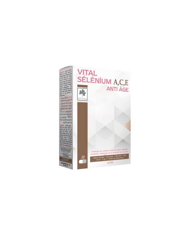 Vital Sélénium A C E Anti-Âge est formulé à partir d’un complexe synergiques de sélénium, vitamines A, C et E, ainsi que d’autres nutriments bénéfiques pour la peau. Ces composants agissent en harmonie pour neutraliser les radicaux libres, ralentir le vieillissement cellulaire et préserver la structure du collagène.