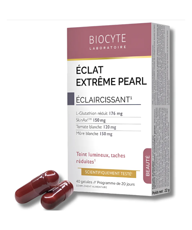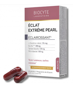 Biocyte Éclat Extrême Pearl est un complément alimentaire en gélules, formulé avec de la Vitamine C, du Zinc, du L-Glutathion et des extraits de plantes pour améliorer l'éclat et la qualité de la peau.