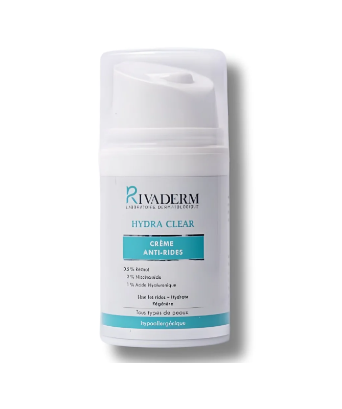 RIVADERM Hydra Clear Crème Hydra Anti-Rides 50 g est un soin hydratant et lissant formulé pour aider à prévenir et atténuer les rides et ridules. Elle hydrate intensément la peau tout en améliorant sa fermeté et son élasticité, pour un teint plus lisse et visiblement plus jeune.