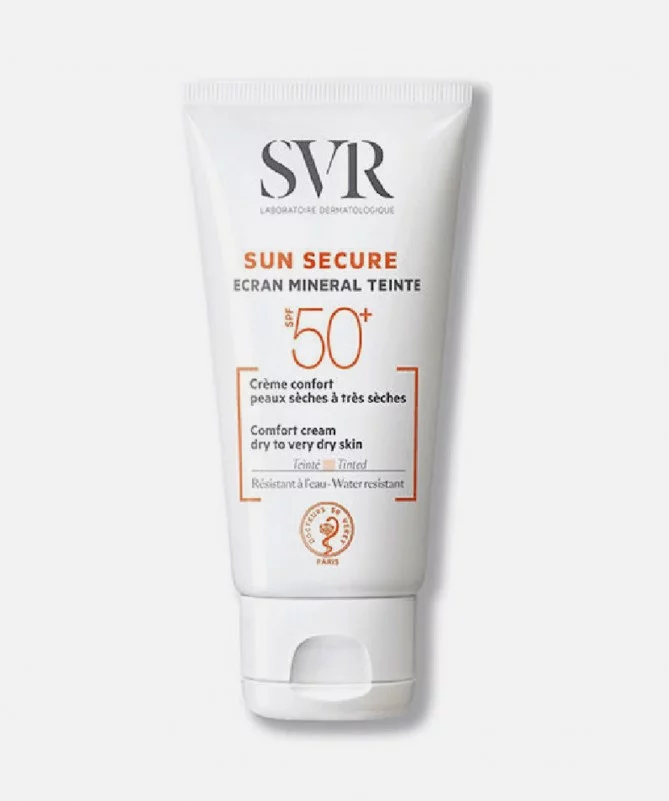 SUN SECURE Écran Minéral Teinté SPF50+ est un soin qui allie très haute protection SPF50+ 100% minérale et maquillage. Il convient aux peaux intolérantes mais aussi aux femmes qui souhaitent se maquiller au soleil toute l’année. Grâce à sa bonne couvrance, les imperfections sont camouflées, le teint unifié toute la journée. Il existe en deux versions : crème toucher sec peaux normales à mixtes et crème confort peaux sèches à très sèches.