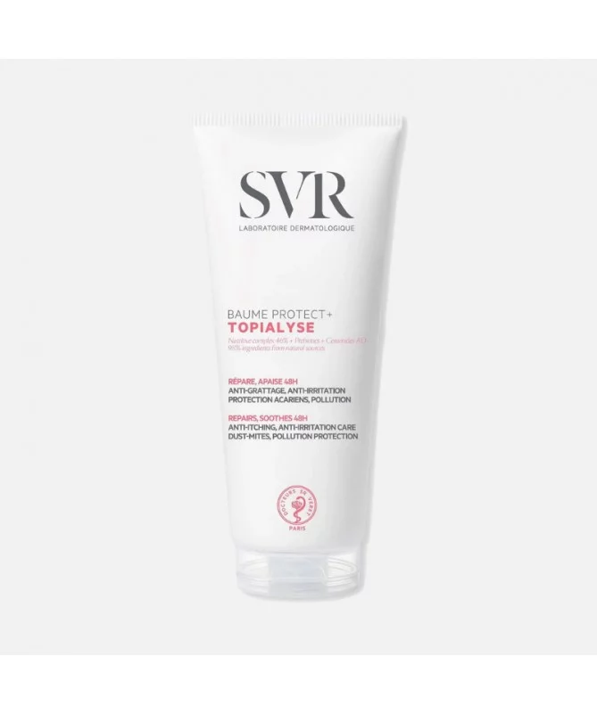 SVR TOPIALYSE BAUME PROTECT+ protège toutes les peaux atopiques, irritées par les agressions extérieures (acariens, pollution...), et ne pique pas. Il répare et apaise les irritations lors d'une utilisation régulière. Extrêmement efficace contre les rougeurs et les démangeaisons, le Baume Protect+ est enrichi en Céramides AD(1) brevetées qui apporte une protection face aux agressions extérieures (acariens, pollution…) qui peuvent aggraver les irritations et les crises de grattages. Sa texture nourrissante relipidante fond et laisse un film protecteur à la surface de la peau avec un effet anti-adhésion des microparticules de pollution