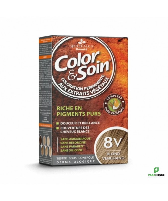 3 CHÊNES COLOR & SOIN COLORATION - 8V BLOND VENEZIANO Le numéro 1 de la coloration permanente végétale. Color & Soin la couleur BLOND VENEZIANO est douce pour les cheveux, simple d'utilisation et résiste aux shampooings. Le Laboratoire les 3 CHÊNES® a développé une ligne de coloration permanente 100% efficace et naturelle : sans silicone sans ammoniaque, sans résorcine, sans paraben.. Color et Soin 8V Testée dermatologiquement, Color&Soin est prescrite par des dermatologues. Sans ammoniaque, Sans résorcine, Sans paraben, ni silicone 100% couverture cheveux blanc 100 % éclat et brillance Résitance aux U.V. et au chlore Color & soin : 28 teintes Etui contenant : un flacon de 60 mL de teinture aux extraits végétaux un flacon de 60 mL de fixateur un sachet de 15 mL de baume capillaire une paire de gants protecteurs une notice explicative COMMENT APPLIQUER COLOR ET SOIN : PREPARATION Placez une serviette sur vos épaules pour protéger vos vêtements, puis enfilez la paire de gants. Versez le contenu de la Teinture aux extraits végétaux COLOR & SOIN dans le flacon Fixateur de couleur. Revissez bien le bouchon du flacon applicateur et agitez-le jusqu’à obtenir un mélange parfaitement homogène. Dévissez la pointe du bouchon du flacon applicateur, et commencez l’application immédiatement. APPLICATION Séparez les cheveux en quatre zones à l’aide d’un peigne et appliquez soigneusement sur les racines, grâce à l’embout applicateur. Répartissez ensuite le mélange colorant sur toute la longueur de vos cheveux. Utilisez la totalité du produit pour la coloration. Malaxez légèrement pour bien imprégner la totalité des cheveux. Précautions d’emploi Les colorants capillaires peuvent provoquer des réactions allergiques sévères. Lire et suivre attentivement les instructions. Ce produit n’est pas destiné à être utilisé sur les personnes de moins de 16 ans. Les tatouages temporaires noirs à base de henné peuvent augmenter les risques d’allergie. Ne vous colorez pas les cheveux si : Vous présentez une éruption cutanée sur le visage ou si votre cuir chevelu est sensible, irrité ou abîmé. Vous avez déjà fait une réaction après avoir coloré vos cheveux. Vous avez fait par le passé une réaction à un tatouage temporaire noir à base de henné. Vous avez déjà fait une coloration à base de henné. Color&soin® est incompatible avec le henné. En cas de sensation de chaleur, picotements et/ou démangeaisons lors de la coloration, rincez immédiatement. Porter des gants appropriés. Evitez toute application du produit hors du cuir chevelu. Ne pas employer pour la coloration des cils et des sourcils. Evitez le contact du produit avec les yeux. Rincer immédiatement les yeux si le produit entre en contact avec ceux-ci. Préparez et appliquez le mélange de préférence dans un endroit bien aéré.