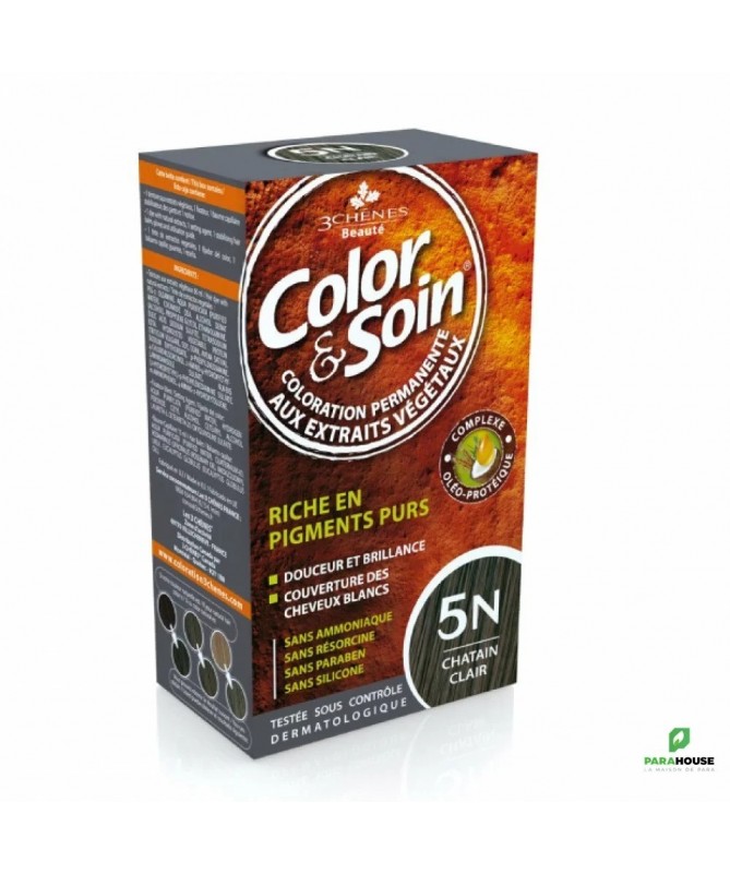 3 CHÊNES COLOR & SOIN COLORATION - 5N CHÂTAIN CLAIR Le numéro 1 de la coloration permanente végétale. Color Soin 5N doux pour les cheveux, simple d'utilisation et résiste aux shampooings. Le Laboratoire les 3 CHÊNES® a développé une ligne de coloration permanente 100% efficace et naturelle : sans silicone sans ammoniaque, sans résorcine, sans paraben.. Color et Soin 5N est Testée dermatologiquement, Color&Soin est prescrite par des dermatologues. Sans ammoniaque, Sans résorcine, Sans paraben, ni silicone 100% couverture cheveux blanc 100 % éclat et brillance Résitance aux U.V. et au chlore Color soin : 28 teintes Etui contenant : un flacon de 60 mL de teinture aux extraits végétaux un flacon de 60 mL de fixateur un sachet de 15 mL de baume capillaire une paire de gants protecteurs une notice explicative COMMENT APPLIQUER COLOR ET SOIN : PREPARATION Placez une serviette sur vos épaules pour protéger vos vêtements, puis enfilez la paire de gants. Versez le contenu de la Teinture aux extraits végétaux COLOR & SOIN dans le flacon Fixateur de couleur. Revissez bien le bouchon du flacon applicateur et agitez-le jusqu’à obtenir un mélange parfaitement homogène. Dévissez la pointe du bouchon du flacon applicateur, et commencez l’application immédiatement. APPLICATION Séparez les cheveux en quatre zones à l’aide d’un peigne et appliquez soigneusement sur les racines, grâce à l’embout applicateur. Répartissez ensuite le mélange colorant sur toute la longueur de vos cheveux. Utilisez la totalité du produit pour la coloration. Malaxez légèrement pour bien imprégner la totalité des cheveux. Précautions d’emploi Les colorants capillaires peuvent provoquer des réactions allergiques sévères. Lire et suivre attentivement les instructions. Ce produit n’est pas destiné à être utilisé sur les personnes de moins de 16 ans. Les tatouages temporaires noirs à base de henné peuvent augmenter les risques d’allergie. Ne vous colorez pas les cheveux si : Vous présentez une éruption cutanée sur le visage ou si votre cuir chevelu est sensible, irrité ou abîmé. Vous avez déjà fait une réaction après avoir coloré vos cheveux. Vous avez fait par le passé une réaction à un tatouage temporaire noir à base de henné. Vous avez déjà fait une coloration à base de henné. Color&soin® est incompatible avec le henné. En cas de sensation de chaleur, picotements et/ou démangeaisons lors de la coloration, rincez immédiatement. Porter des gants appropriés. Evitez toute application du produit hors du cuir chevelu. Ne pas employer pour la coloration des cils et des sourcils. Evitez le contact du produit avec les yeux. Rincer immédiatement les yeux si le produit entre en contact avec ceux-ci. Préparez et appliquez le mélange de préférence dans un endroit bien aéré.