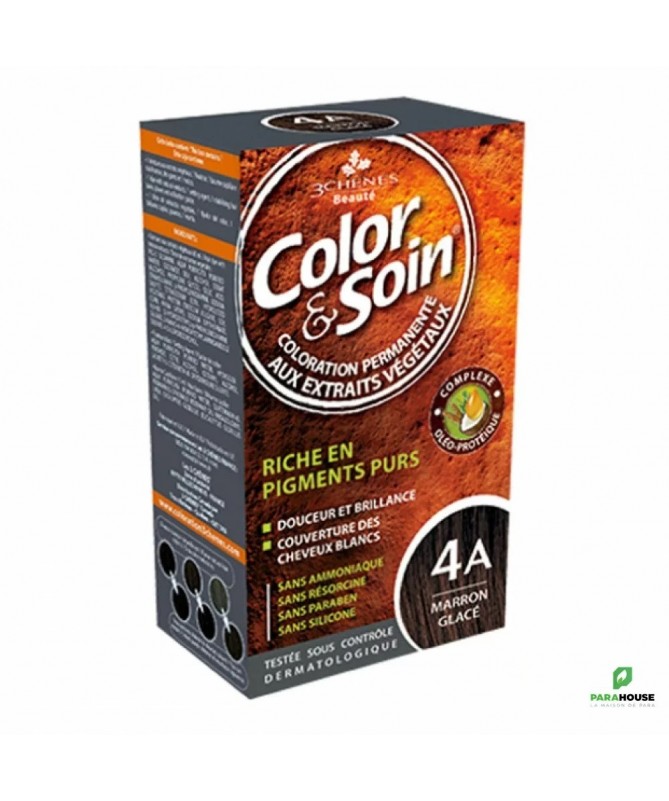 3 CHÊNES COLOR & SOIN COLORATION - 4A MARRON GLACÉ Le numéro 1 de la coloration permanente végétale. Color et Soin MARRON GLACÉ est doux pour les cheveux, simple d'utilisation et résiste aux shampooings. Le Laboratoire les 3 CHÊNES® a développé une ligne de coloration permanente 100% efficace et naturelle : sans silicone sans ammoniaque, sans résorcine, sans paraben.. Color et Soin 4A Testée dermatologiquement, Color&Soin est prescrite par des dermatologues. Sans ammoniaque, Sans résorcine, Sans paraben, ni silicone 100% couverture cheveux blanc 100 % éclat et brillance Résitance aux U.V. et au chlore Color & soin : 28 teintes Etui contenant : un flacon de 60 mL de teinture aux extraits végétaux un flacon de 60 mL de fixateur un sachet de 15 mL de baume capillaire une paire de gants protecteurs une notice explicative COMMENT APPLIQUER COLOR ET SOIN : PREPARATION Placez une serviette sur vos épaules pour protéger vos vêtements, puis enfilez la paire de gants. Versez le contenu de la Teinture aux extraits végétaux COLOR & SOIN dans le flacon Fixateur de couleur. Revissez bien le bouchon du flacon applicateur et agitez-le jusqu’à obtenir un mélange parfaitement homogène. Dévissez la pointe du bouchon du flacon applicateur, et commencez l’application immédiatement. APPLICATION Séparez les cheveux en quatre zones à l’aide d’un peigne et appliquez soigneusement sur les racines, grâce à l’embout applicateur. Répartissez ensuite le mélange colorant sur toute la longueur de vos cheveux. Utilisez la totalité du produit pour la coloration. Malaxez légèrement pour bien imprégner la totalité des cheveux. Précautions d’emploi Les colorants capillaires peuvent provoquer des réactions allergiques sévères. Lire et suivre attentivement les instructions. Ce produit n’est pas destiné à être utilisé sur les personnes de moins de 16 ans. Les tatouages temporaires noirs à base de henné peuvent augmenter les risques d’allergie. Ne vous colorez pas les cheveux si : Vous présentez une éruption cutanée sur le visage ou si votre cuir chevelu est sensible, irrité ou abîmé. Vous avez déjà fait une réaction après avoir coloré vos cheveux. Vous avez fait par le passé une réaction à un tatouage temporaire noir à base de henné. Vous avez déjà fait une coloration à base de henné. Color&soin® est incompatible avec le henné. En cas de sensation de chaleur, picotements et/ou démangeaisons lors de la coloration, rincez immédiatement. Porter des gants appropriés. Evitez toute application du produit hors du cuir chevelu. Ne pas employer pour la coloration des cils et des sourcils. Evitez le contact du produit avec les yeux. Rincer immédiatement les yeux si le produit entre en contact avec ceux-ci. Préparez et appliquez le mélange de préférence dans un endroit bien aéré.