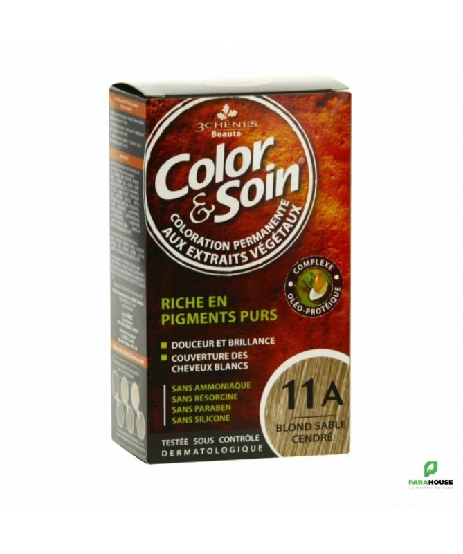 3 CHÊNES COLOR & SOIN COLORATION - 11A BLOND SABLE CENDRÉ Le numéro 1 de la coloration permanente végétale. Color Soin doux pour les cheveux, simple d'utilisation et résiste aux shampooings. Le Laboratoire les 3 CHÊNES® a développé une ligne de coloration permanente 100% efficace et naturelle : sans silicone sans ammoniaque, sans résorcine, sans paraben.. Color et Soin la coloration blond sable cendré est Testée dermatologiquement, Color&Soin est prescrite par des dermatologues. Sans ammoniaque, Sans résorcine, Sans paraben, ni silicone 100% couverture cheveux blanc 100 % éclat et brillance Résitance aux U.V. et au chlore Color & soin : 28 teintes Etui contenant : un flacon de 60 mL de teinture aux extraits végétaux un flacon de 60 mL de fixateur un sachet de 15 mL de baume capillaire une paire de gants protecteurs une notice explicative COMMENT APPLIQUER COLOR ET SOIN : PREPARATION Placez une serviette sur vos épaules pour protéger vos vêtements, puis enfilez la paire de gants. Versez le contenu de la Teinture aux extraits végétaux COLOR & SOIN dans le flacon Fixateur de couleur. Revissez bien le bouchon du flacon applicateur et agitez-le jusqu’à obtenir un mélange parfaitement homogène. Dévissez la pointe du bouchon du flacon applicateur, et commencez l’application immédiatement. APPLICATION Séparez les cheveux en quatre zones à l’aide d’un peigne et appliquez soigneusement sur les racines, grâce à l’embout applicateur. Répartissez ensuite le mélange colorant sur toute la longueur de vos cheveux. Utilisez la totalité du produit pour la coloration. Malaxez légèrement pour bien imprégner la totalité des cheveux. Précautions d’emploi Les colorants capillaires peuvent provoquer des réactions allergiques sévères. Lire et suivre attentivement les instructions. Ce produit n’est pas destiné à être utilisé sur les personnes de moins de 16 ans. Les tatouages temporaires noirs à base de henné peuvent augmenter les risques d’allergie. Ne vous colorez pas les cheveux si : Vous présentez une éruption cutanée sur le visage ou si votre cuir chevelu est sensible, irrité ou abîmé. Vous avez déjà fait une réaction après avoir coloré vos cheveux. Vous avez fait par le passé une réaction à un tatouage temporaire noir à base de henné. Vous avez déjà fait une coloration à base de henné. Color&soin® est incompatible avec le henné. En cas de sensation de chaleur, picotements et/ou démangeaisons lors de la coloration, rincez immédiatement. Porter des gants appropriés. Evitez toute application du produit hors du cuir chevelu. Ne pas employer pour la coloration des cils et des sourcils. Evitez le contact du produit avec les yeux. Rincer immédiatement les yeux si le produit entre en contact avec ceux-ci. Préparez et appliquez le mélange de préférence dans un endroit bien aéré.