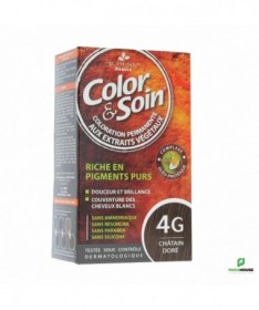 3 CHÊNES COLOR & SOIN COLORATION - 4G CHÂTAIN DORÉ Le numéro 1 de la coloration permanente végétale. Color Soin 4G doux pour les cheveux, simple d'utilisation et résiste aux shampooings. Le Laboratoire les 3 CHÊNES a développé une ligne de coloration permanente 100% efficace et naturelle : sans silicone sans ammoniaque, sans résorcine, sans paraben.. Color et Soin est Testée dermatologiquement, Color&Soin est prescrite par des dermatologues. Sans ammoniaque, Sans résorcine, Sans paraben, ni silicone 100% couverture cheveux blanc 100 % éclat et brillance Résitance aux U.V. et au chlore Color & soin : 28 teintes Etui contenant : un flacon de 60 mL de teinture aux extraits végétaux un flacon de 60 mL de fixateur un sachet de 15 mL de baume capillaire une paire de gants protecteurs une notice explicative COMMENT APPLIQUER COLOR ET SOIN : PREPARATION Placez une serviette sur vos épaules pour protéger vos vêtements, puis enfilez la paire de gants. Versez le contenu de la Teinture aux extraits végétaux COLOR & SOIN dans le flacon Fixateur de couleur. Revissez bien le bouchon du flacon applicateur et agitez-le jusqu’à obtenir un mélange parfaitement homogène. Dévissez la pointe du bouchon du flacon applicateur, et commencez l’application immédiatement. APPLICATION Séparez les cheveux en quatre zones à l’aide d’un peigne et appliquez soigneusement sur les racines, grâce à l’embout applicateur. Répartissez ensuite le mélange colorant sur toute la longueur de vos cheveux. Utilisez la totalité du produit pour la coloration. Malaxez légèrement pour bien imprégner la totalité des cheveux. Précautions d’emploi Les colorants capillaires peuvent provoquer des réactions allergiques sévères. Lire et suivre attentivement les instructions. Ce produit n’est pas destiné à être utilisé sur les personnes de moins de 16 ans. Les tatouages temporaires noirs à base de henné peuvent augmenter les risques d’allergie. Ne vous colorez pas les cheveux si : Vous présentez une éruption cutanée sur le visage ou si votre cuir chevelu est sensible, irrité ou abîmé. Vous avez déjà fait une réaction après avoir coloré vos cheveux. Vous avez fait par le passé une réaction à un tatouage temporaire noir à base de henné. Vous avez déjà fait une coloration à base de henné. Color&soin® est incompatible avec le henné. En cas de sensation de chaleur, picotements et/ou démangeaisons lors de la coloration, rincez immédiatement. Porter des gants appropriés. Evitez toute application du produit hors du cuir chevelu. Ne pas employer pour la coloration des cils et des sourcils. Evitez le contact du produit avec les yeux. Rincer immédiatement les yeux si le produit entre en contact avec ceux-ci. Préparez et appliquez le mélange de préférence dans un endroit bien aéré.