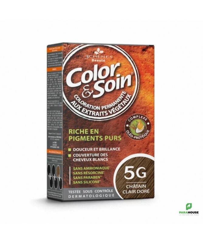 3 CHÊNES COLOR & SOIN COLORATION - 5G CHÂTAIN CLAIR DORÉ Le numéro 1 de la coloration permanente végétale. Color et Soin 5G est doux pour les cheveux, simple d'utilisation et résiste aux shampooings. Le Laboratoire 3 CHÊNES® a développé une ligne 3 chênes coloration permanente 100% efficace et naturelle : sans silicone sans ammoniaque, sans résorcine, sans paraben.. Color Soin 5g est Testée dermatologiquement, Color&Soin est prescrite par des dermatologues. Sans ammoniaque, Sans résorcine, Sans paraben, ni silicone 100% couverture cheveux blanc 100 % éclat et brillance Résitance aux U.V. et au chlore Color et soin : 28 teintes Etui contenant : un flacon de 60 mL de teinture aux extraits végétaux un flacon de 60 mL de fixateur un sachet de 15 mL de baume capillaire une paire de gants protecteurs une notice explicative COMMENT APPLIQUER COLOR ET SOIN : PREPARATION Placez une serviette sur vos épaules pour protéger vos vêtements, puis enfilez la paire de gants. Versez le contenu de la Teinture aux extraits végétaux COLOR & SOIN dans le flacon Fixateur de couleur. Revissez bien le bouchon du flacon applicateur et agitez-le jusqu’à obtenir un mélange parfaitement homogène. Dévissez la pointe du bouchon du flacon applicateur, et commencez l’application immédiatement. APPLICATION Séparez les cheveux en quatre zones à l’aide d’un peigne et appliquez soigneusement sur les racines, grâce à l’embout applicateur. Répartissez ensuite le mélange colorant sur toute la longueur de vos cheveux. Utilisez la totalité du produit pour la coloration. Malaxez légèrement pour bien imprégner la totalité des cheveux. Précautions d’emploi Les colorants capillaires peuvent provoquer des réactions allergiques sévères. Lire et suivre attentivement les instructions. Ce produit n’est pas destiné à être utilisé sur les personnes de moins de 16 ans. Les tatouages temporaires noirs à base de henné peuvent augmenter les risques d’allergie. Ne vous colorez pas les cheveux si : Vous présentez une éruption cutanée sur le visage ou si votre cuir chevelu est sensible, irrité ou abîmé. Vous avez déjà fait une réaction après avoir coloré vos cheveux. Vous avez fait par le passé une réaction à un tatouage temporaire noir à base de henné. Vous avez déjà fait une coloration à base de henné. Color&soin® est incompatible avec le henné. En cas de sensation de chaleur, picotements et/ou démangeaisons lors de la coloration, rincez immédiatement. Porter des gants appropriés. Evitez toute application du produit hors du cuir chevelu. Ne pas employer pour la coloration des cils et des sourcils. Evitez le contact du produit avec les yeux. Rincer immédiatement les yeux si le produit entre en contact avec ceux-ci. Préparez et appliquez le mélange de préférence dans un endroit bien aéré.