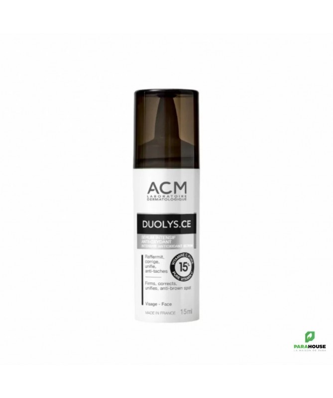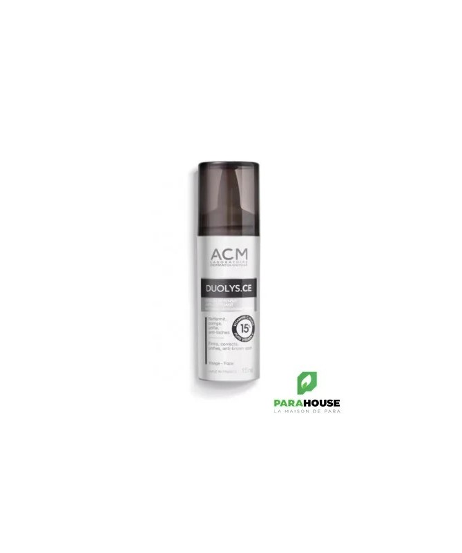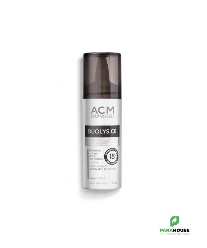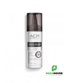 ACM DUOLYS CE SERUM 15ML Le sérum ACM DUOLYS SERUM INTENSIF est la réponse à vos peaux ternes, fatiguées et âgées. Formulé pour les peaux du visage 30 ans et plus. Le CE Sérum enrichi en vitamine C pure anti-oxydante aux extrêmes vertus lissantes et antirides redonnant souplesse et élasticité. Duolys serum intensif anti ride permet de lutter contre tous les signes de l'âge : rides et plis, perte de fermeté, taches brunes et manque d'éclat. Afin de maintenir la stabilité, chaque actif libère toute sa puissance anti-âge sur le visage, le cou et le décolleté tout en respectant les peaux les plus fragiles. Composition : Aqua (Water), Ascorbic Acid, Glycerin, Polymethylsilsesquioxane, Sodium Lactate, HDI/Trimethylol Hexyllactone Crosspolymer, Dimethicone, Tocotrienols, Helianthus Annuus (Sunflower) Seed Oil, Phospholipids, Disodium EDTA, Dimethylacrylamide/Acrylic Acid/Polystyrene Ethyl Methacrylate Copolymer, Coco Caprylate/Caprate, Decyl Glucoside, Caprylyl Glycol, Hexylene Glycol Sodium Acrylates Copolymer, Hydrogenated Polyisobutene, Polyglyceryl-10 Stearate, Beta-Sitosterol, t-Butyl Alcohol, , CI 15985 (Yellow 6), CI 19140 (Yellow 5), Squalene, Sorbitan Caprylate, Polysilicone-11, Phenoxyethanol, Butylene Glycol, Isododecane, Polyacrylate Crosspolymer-6, Elaeis Guineensis (Palm) Oil, Tocopherol, Chlorphenesin, Dimethicone PEG-7 Phosphate, Parfum (Fragrance). Conseils d'utilisation : Il est conseillé de : Retirer l’opercule en aluminium Mélanger les poudres ou sérum en pressant 2 ou 3 fois la membrane souple en bas du flacon. Agiter le flacon 5 / 6 fois. Appuyer sur la membrane souple pour faire sortir le produit et l’appliquer sur la peau