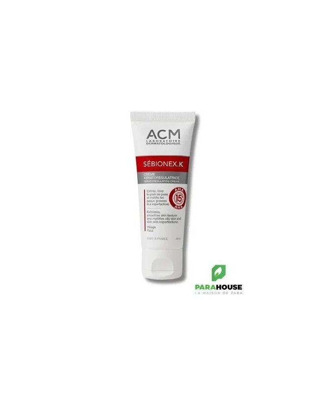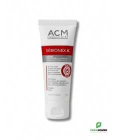 ACM Sébionex.K Crème Kératorégulatrice 40 mlACM Sébionex.Kest une crème kératorégulatrice idéale pour les peaux grasses et à imperfections. Elle exfolie en douceur, affine le grain de peau et contrôle durablement la brillance.Propriétés :- Exfoliation progressive grâce à 3 formes d’AHA (15%) pour une tolérance optimale.- Régule le sébum et purifie la peau avec du gluconate de zinc.- Matifie la peau grâce à un agent matifiant (5%) qui absorbe l’excès de sébum.- Laisse la peau plus lisse, nette et sans brillance.Fabriqué en France.Conseils d'utilisation :Appliquer matin et/ou soir sur une peau propre et sèche.Indication :Convient pour exfolier, lisser et matifier les peaux grasses et à imperfections.Composition :Aqua (Water), Ammonium Glycolate, Nylon-12, C12-13 Alkyl Lactate, Propanediol, Steareth-21, Glycolic Acid, Ammonium Lactate, Steareth-2, Cyclopentasiloxane, Isohexadecane, Stearic Acid, Ammonium Hydroxide, Cyclohexasiloxane, PEG-150/Decyl Alcohol/SMDI Copolymer, Bisabolol, Lactic Acid, Zinc Gluconate, Gluconolactone, Calcium Gluconate, Polyacrylamide, C13-14 Isoparaffin, Propylene Glycol, Chlorphenesin, Sodium Hydroxide, Sodium Benzoate, Laureth-7, Xanthan Gum, Parfum (Fragrance).