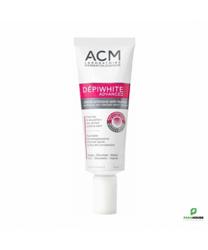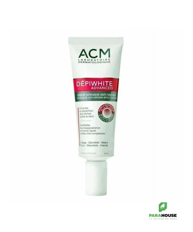 ACM DEPIWHITE ADVANCED CREME INTENSIVE ANTI TACHES 40ML ACM DEPIWHITE ADVANCED CREME INTENSIVE ANTI TACHES FAVORISE LA DISPARITION DES TACHES BRUNES TYPE MASQUE DE GROSSESSE, VIEILLISSEMENT. ACM Dépiwhite Advanced permet d'atténuer ou éliminer les taches brunes, limiter leur réapparition et unifier la couleur du teint en régulant la production de mélanine, responsable des taches, par 3 actions synergiques Grâce à son association d’actifs spécifiques, Ralentissement de la production de mélanine Élimination de la mélanine épidermique existante Stimulation de la biodégradation de la mélanine Composition : Aqua (Water), C12-13 Alkyl Lactate, Vitis Vinifera (Grape) Seed Oil, Glycerin, Glyceryl Stearate, PEG-100 Stearate, Butylene Glycol, Kojic Acid, Propylene Glycol, Cetearyl Alcohol, Stearyl Alcohol, Cyclopentasiloxane, Paraffinum Liquidum (Mineral Oil), Coco-Glucoside, Dimethicone, Potassium Cetyl Phosphate, Magnesium Sulfate, Manganese Sulfate, Lactic Acid, Aluminum Silicate, Ascorbyl Methylsilanol Pectinate, Niacinamide , Reseda Luteola Extract, Arctostaphylos Uva Ursi Leaf Extract, Carum Petroselinum (Parsley) Extract, Cyclohexasiloxane, Phenoxyethanol, Sodium Acrylate/Sodium Acryloyldimethyl Taurate Copolymer, Cera Microcristallina (Microcrystalline Wax), Isohexadecane, Paraffin, Tocopherol, Polyacrylate Crosspolymer-6, Polysorbate 80, Disodium EDTA, Methylpropanediol, O-Cymen-5-Ol, Sodium Metabisulfite, t-Butyl Alcohol, Sodium Sulfite, Sorbitan Oleate. Conseils d'utilisation: Il est recommandé d'appliquer la crème intensive anti taches Dépiwhite advanced une fois par jour, seulement sur les zones concernées du cou, du visage ou du décolleté et uniquement sur de petites surfaces pendant 2 à 6 mois.