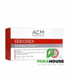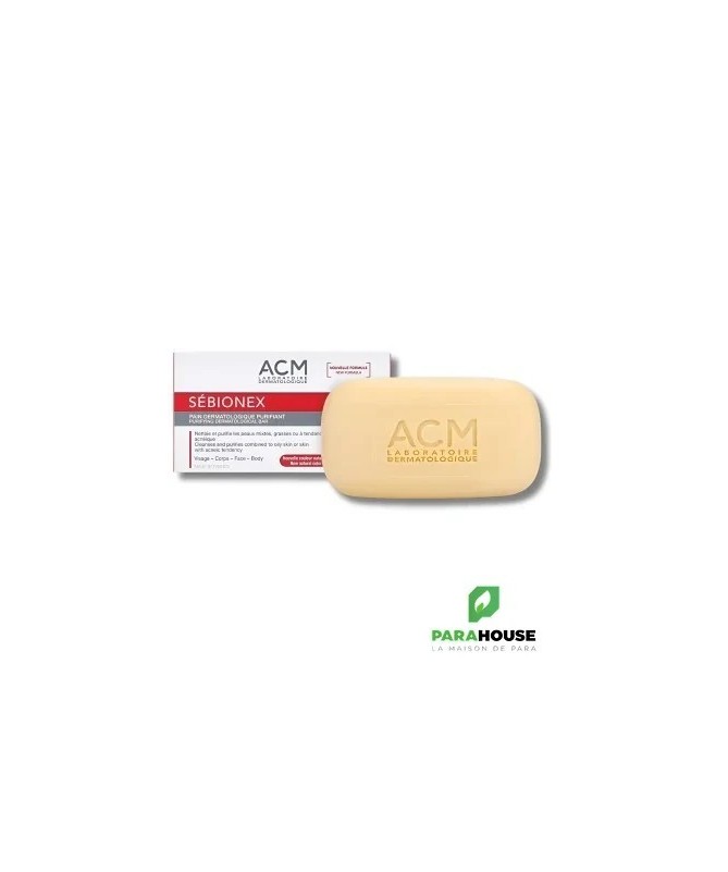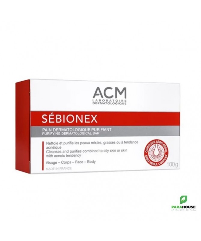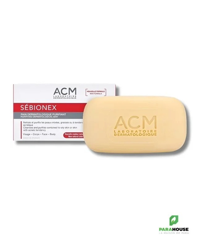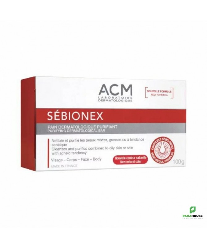 Description :Laboratoire ACM Sébionex Pain Dermatologique Purifiant 100 g est un nettoyant doux purifiant qui élimine en douceur les impuretés et l'excès de sébum, sans dessécher, pour un véritable plaisir d'utilisation au quotidien. Il est particulièrement adapté aux peaux mixtes à grasses, ou à tendance acnéique.Utilisé quotidiennement, ce pain dermatologique élimine les impuretés sans agresser la peau. Avec son complexe Sébo-Régul, il régule l'excès de sébum, limite la prolifération bactérienne et assainit l'épiderme. Sans savon, il respecte l'équilibre naturel de la peau et limite les sensations de tiraillements grâce à ses agents nettoyants.Il laisse la peau nette, fraîche, purifiée.Sans savon, pH physiologique. Non comédogène.Fabriqué en France.Conseils d'utilisation :Faire mousser avant d'appliquer sur la peau préalablement mouillée.Éviter le contact avec les yeux. En cas de contact avec les yeux, rincer soigneusement à l'eau.Indication : Peaux mixtes à grasses, ou à tendance acnéique. Visage et corps.Composition :Zea Mays (Corn) Starch, Potassium Lauryl Sulfate, Cetearyl Alcohol, Sodium Lauryl Sulfate, Aqua (Water), Hydrogenated Castor Oil, Glycerin, Rhamnose, Lactic Acid, Piroctone Olamine, Zinc Sulfate, Zinc PCA, Propanediol, Paraffinum Liquidum (Mineral Oil), Cocamidopropyl Betaine, CI 77891 (Titanium Dioxide), CI 77492 (Iron Oxides), Potassium Phosphate, Glucose, Glucuronic Acid, Parfum (Fragrance).