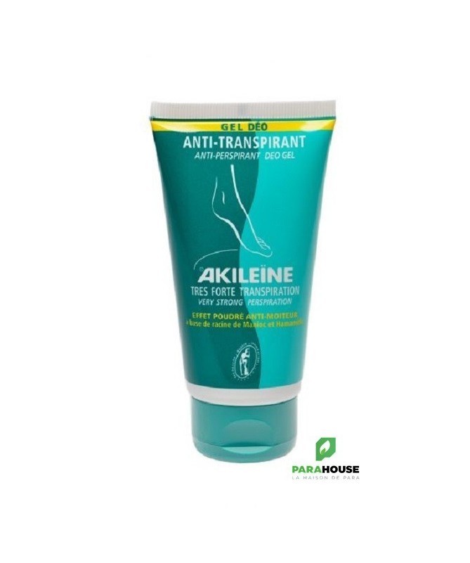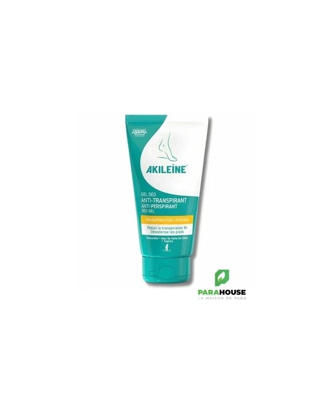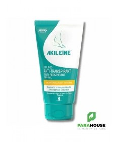 Akileïne Gel-Déo Anti-Transpirant 75 mlAkileïne Gel-Déo Anti-Transpirant est spécialement conçu pour les pieds souffrant d'une transpiration très abondante. Sa formule agit pour réduire la transpiration tout en désodorisant durablement.Ingrédients clés :- Poudre de tapioca :extraite de la racine de manioc, elle procure un effet asséchant.- Écorce d'hamamélis :aide à maintenir le pH de la peau, régule la transpiration et limite les odeurs.- Noix de galle de chêne :possède des propriétés adoucissantes et astringentes, réduisant les irritations.Le gel agit immédiatement pour désodoriser les pieds et diminue l'inconfort lié à la transpiration. Son effet anti-transpirant dure jusqu'à 8 heures après application.Il pénètre rapidement sans coller et convient parfaitement aux peaux sensibles.