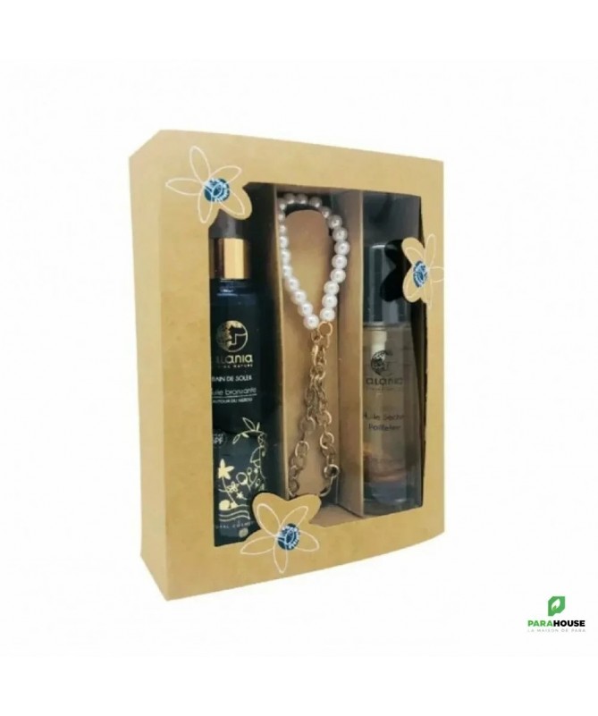 ALANIA Coffret Cadeau Beauté Solaire - Néroli Ce coffret de compose de : ALANIA Huile sèche pailletée : ALANIA Huile sèche pailletée est une huile embellissante qui intègre des paillettes naturelles. Elle permet de nourrir, adoucir et illuminer la peau. ALANIA Bain de Soleil - Huile bronzante Néroli : Pour une peau hâlée et lumineuse, ALANIA Bain de Soleil - Huile bronzante Néroli protége des rayons UV du soleil tout en stimulant le bronzage naturel. EN CADEAU : Joli Colier