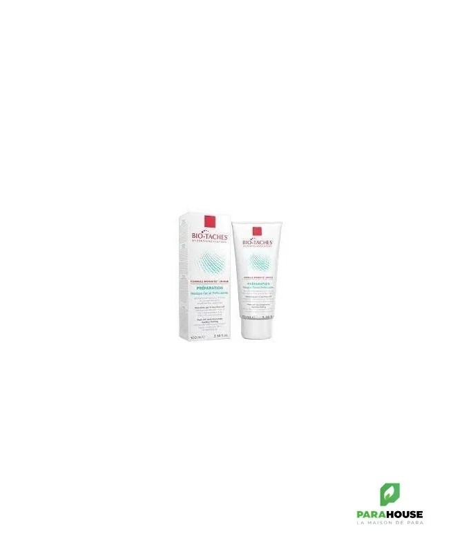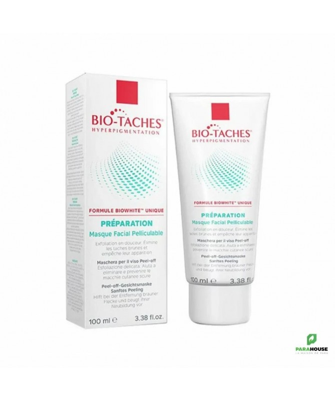BIO TACHES PREPARATION MASQUE PELLICULABLE 100ML BIO TACHES MASQUE : Ce soin est destiné pour les taches brunes. Il peut être utilisé pour le visage et le cou. C'est un masque dépigmentant. Bio Taches Masque peut assurer une parfaite pénétration dans l'épiderme. Il en résulte une inhibition rapide des complexes tyrosinases qui sont responsables de la synthèse de la mélanine et donc de l'apparition des taches brunes. En association avec Bio Taches Émulsion, bio taches masque permettra d'obtenir un résultat claire et surtout plus rapide sur les hyperpigmentations. Composition : Formule INCI : Kaolin, laureth-4, PVP, aluminium starch octenyl succinate, aqua, alcohol denat, polyvinyl alcohol, glycerin, C13-14 isoparaffin, laureth-7, CI 77891, polyacrylamide, scutellaria baicalensis, disodium EDTA, saxifraga sarmentosa, vitis vinifera, butylene glycol, morus bombycis, bisabolol, citrus nobilis peel oil, phenoxyethanol, methylparaben, tetrasodium EDTA, triethanolamine, limonene, farnesol. NB : Sans parfum. Conseils d'utilisation : Il est indiqué de l'appliquer bio taches masque en couche uniforme sur le visage et le cou, puis,il faut le laisser sécher environ 20 minutes. A renouveler l'application de Bio taches Masque 2 fois par semaine en complément avec votre traitement quotidien Bio Taches Émulsion