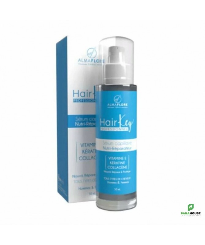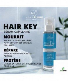 ALMAFLORE HAIR KEY Serum Capillaire Nutri Reparateur 50ML ALMAFLORE HAIR KEY Serum Capillaire Nutri Réparateur est un soin pour les cheveux qui permet de nourrir, réparer et protéger la chevelure. ALMAFLORE HAIR KEY Sérum Capillaire est riche en vitamine E, Kératine et Collagène est déstiné pour tout type de cheveux. Les bienfaits de l'Huile d'Ail ALMAFLORE Stimule la croissance capillaire : Active et nourrit les bulbes pileux pour une pousse plus rapide et vigoureuse. Fortifie et réduit la casse : Renforce la fibre capillaire de l'intérieur, limite la fragmentation des cheveux fragiles et cassants. Réhydrate en profondeur les cheveux secs : Apporte nutrition et souplesse aux cheveux manquant cruellement d'hydratation. Favorise le phénomène de kératinisation : Soutient la formation de kératine saine, essentielle à la solidité et à la résistance du cheveu. Formule concentrée et naturelle : Riche en principes actifs soufrés bénéfiques, dans un format économique et durable. Spécialement adaptée aux cheveux crépus et texturés : Conçue pour répondre aux défis spécifiques de sécheresse et de fragilité de ce type de cheveux. Composition : Vitamine E Collagène Keratine