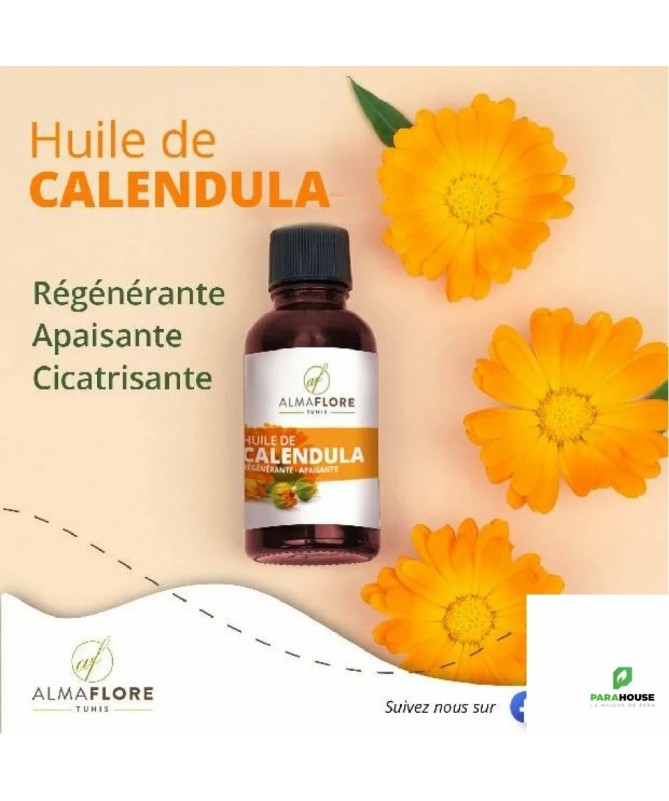 ALMAFLORE Huile de Calendula - Soin Apaisant et Régénérant ALMAFLORE Huile de Calendula est largement utilisée en applications locales pour apaiser et adoucir les peaux sèches ou irritées, soulager les coups de soleil, les brûlures mineures et les piqûres d'insectes, après l'épilation à la cire. Les puissants antioxydants et nutriments aident à protéger la peau de la déshydratation et du vieillissement prématuré. ALMAFLORE Huile de Calendula est un soin idéal pour tout type de peau avec ses vertus anti-irritants, anti-inflammatoires, cicatrisantes et énergisantes. Huile de Calendula un soin 100% naturel et polyvalent pour toute la famille. Spécialement formulée pour apaiser, adoucir et protéger les peaux sensibles, sèches ou irritées, cette huile végétale est un indispensable de votre routine bien-être. Un geste douceur et efficacité, directement livré chez vous par votre parapharmacie en ligne en Tunisie