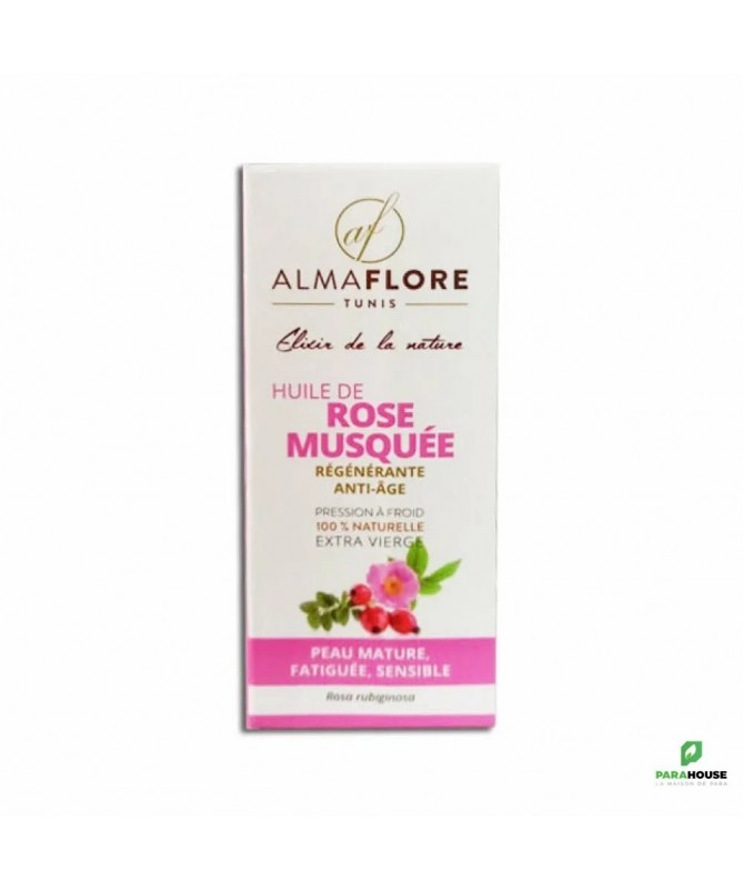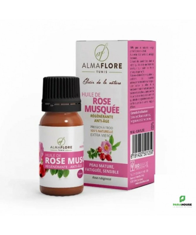 ALMAFLORE Huile de Rose Musquée BIO 10ML Réparatrice puissante, elle améliore visiblement l'aspect des peaux marquées par le temps, les cicatrices ou les taches. Découvrez ce sérum bio aux propriétés régénérantes et antioxydantes exceptionnelles pour une peau lissée, unifiée et rajeunie. Visage: C'est une huile anti-ride et régénérante Cheveux: tonus et brillance Corps: Elle convient pour tous les types de peaux, elle procure une action anti-relachement. ALMAFLORE Huile de Rose Musquée ou huile de Rosier muscat se présente comme une huile de beauté par excellence puisqu'elle accélère la régénération cellulaire de l’épiderme. ALMAFLORE Huile de Rose Musquée traite les tâches de vieillesse , estompe les cicatrices existantes et atténue également les vergetures. Réparatrice Puissante et Régénérante : Réparatrice puissante, elle améliore l'aspect des peaux marquées (cicatrices, vergetures, traces d'acné) en stimulant la production de collagène et d'élastine. Action Anti-Âge et Lissante : Cette activité régénérante couplée à une richesse en antioxydants atténue les rides et lisse les rides superficielles. Elle redensifie la peau. Prévention du Photo-Vieillissement : Grâce à sa richesse en composés antioxydants, elle freine l'apparition des rides prématurées, surtout celles dues au photo-vieillissement (soleil). Unifiant du Teint et Anti-Taches : Elle atténue les taches brunes, notamment dues à l'âge et au soleil, et freine leur apparition pour un teint parfaitement uniforme. Assouplissante et Tonifiante : Assouplissante, elle apporte tonus et aspect neuf à la peau. Elle restaure la barrière hydrolipidique pour une peau souple et confortable. Texture Fine et Pénétrante : Non grasse et rapidement absorbée, elle convient comme sérum de nuit ou de jour sous la crème solaire. Cas d'Usage Recommandés : Sérum Anti-Âge de Nuit : 2-3 gouttes sur l'ensemble du visage, du cou et du décolleté nettoyés. Soin Localisé sur les Cicatrices et les Taches : Appliquer une goutte pure sur la zone concernée en massant légèrement.
