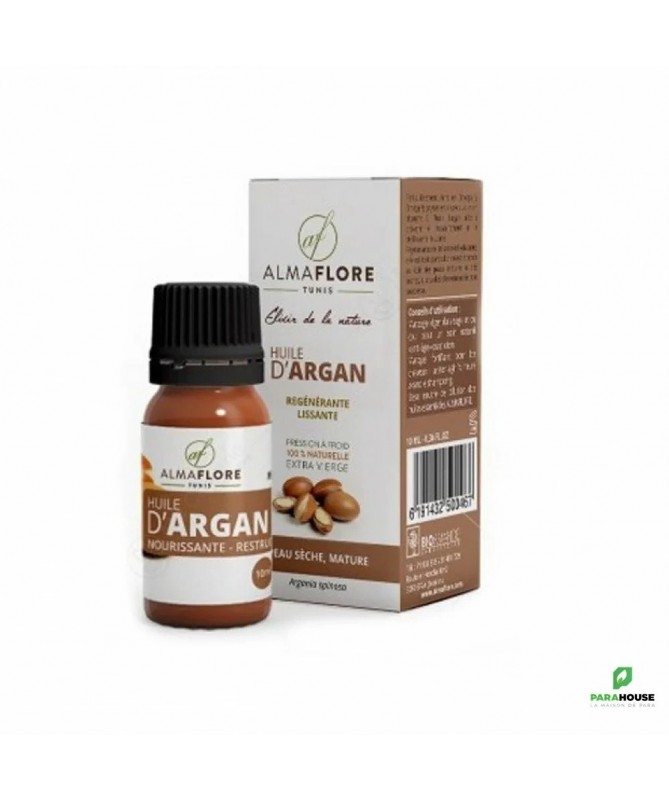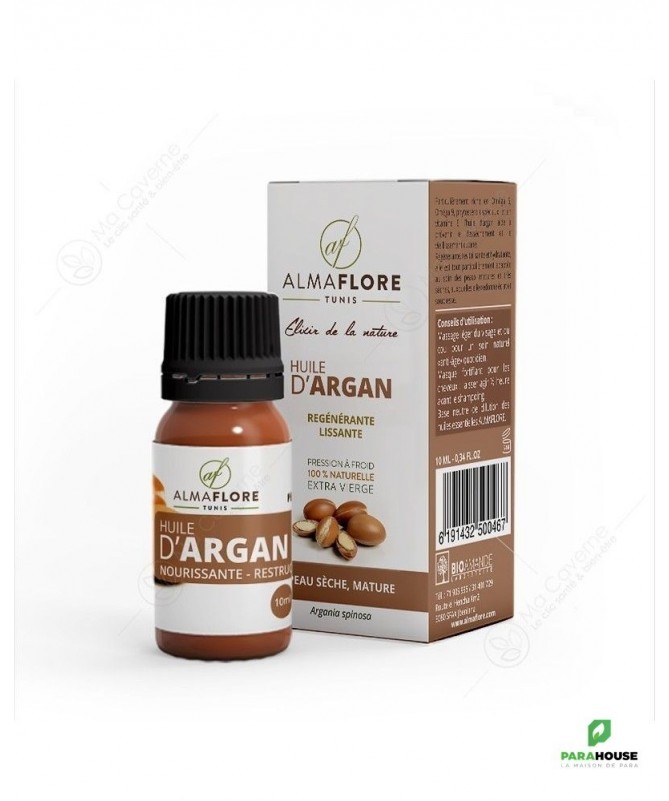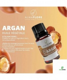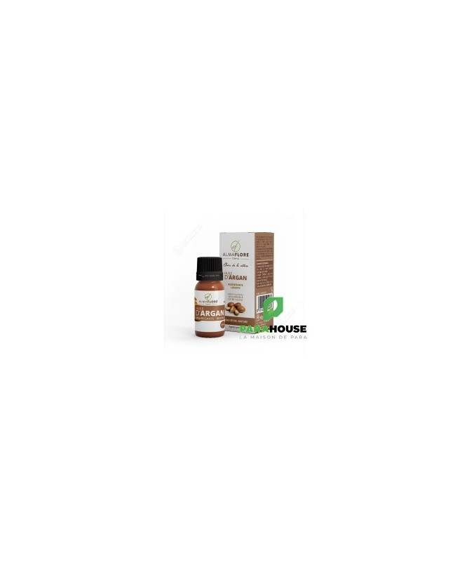 ALMAFLORE Huile d'argan BIO 10ML Origine: Maroc Couleur : jaune clair / brun clair Visage: toutes peaux, peaux sèches, protection climatique (vent, froid, sécheresse) Cheveux: secs et ternes, cassants, pellicules, colorés Corps: base pour huiles corporelles nourrissantes et parfumées, soins des mains, ongles abimés Raffermissante et assouplissante : ALMAFLORE Huile d'ARGAN redonne élasticité et souplesse à la peau. Antioxydante, anti-âge : ALMAFLORE Huile d'ARGAN neutralise les radicaux libres et lutte contre les effets du vieillissement cutané. Extrêmement nourrissante et cicatrisante, elle est très efficace sur les gerçures, les brûlures, les cicatrices d'acné et de varicelle. Protectrice cutanée, elle limite les effets des agressions extérieures (soleil, vent...) Sa composition exceptionnelle en acides gras essentiels (oméga-6 et oméga-9) et en tocophérols (vitamine E) lui confère des propriétés régénérantes, nourrissantes et antioxydantes puissantes. Elle agit en profondeur pour restaurer l'hydratation des peaux les plus sèches, redonner souplesse et brillance aux cheveux dévitalisés, et protéger l'épiderme du stress oxydatif responsable du vieillissement cutané.