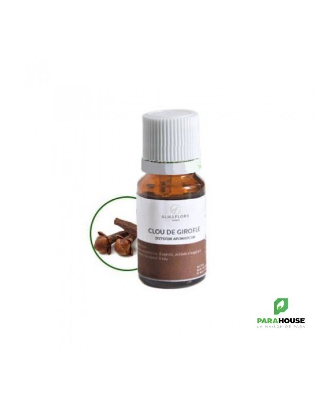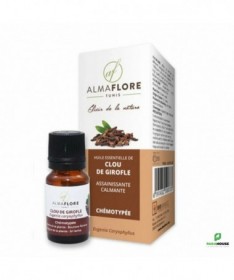 ALMAFLORE Huile Essentielle de clou de girofle BIO 10ML ALMAFLORE Huile Essentielle de clou de girofle est une huile anti-bactérienne. Elle traite multiples infections tels les infections intestinales, urinaires et respiratoires, Elle est également tonifiante et trés utile en cas de coup de fatigue puisqu'elle stimule vos défenses immunitaires. ALMAFLORE Huile Essentielle de clou de girofle est parmis les huiles essentielles les plus efficaces contre les insectes. Pour cela, il faut v ersez dans votre diffuseur 4 gouttes d'huile essentielle de citronnelle + 4 gouttes d'huile essentielle de géranium + 4 gouttes d'HE d'eucalyptus citronné + 2 gouttes d'HE de giroflier. Action Anti-infectieuse Large : Une alliée pour lutter contre les bactéries, virus, champignons et parasites, soutenant l'organisme en période de faiblesse. Soulagement Dentaire Rapide : Propriété anesthésiante et cautérisante reconnue pour apaiser les douleurs pulpaires et les inflammations buccales (à utiliser localement et très diluée). Stimulante Immunitaire : Aide à renforcer les défenses naturelles de l’organisme, idéale en prévention ou en accompagnement en période hivernale. Précautions : Déconseillée aux : Femmes enceintes (tout au long de la grossesse) et femmes allaitantes. Enfants de moins de 6 ans. Personnes souffrant d’insuffisance hépatique (problèmes de foie). Personnes épileptiques ou ayant des antécédents de convulsions (à éviter sans avis médical). Personnes allergiques à l'eugénol ou présentant une sensibilité connue. NE JAMAIS APPLIQUER PURE sur la peau ou les muqueuses. Elle est fortement irritante (dermocaustique) et peut causer brûlures, rougeurs et réactions sévères. Toujours diluer dans une huile végétale (Amande douce, Coco, Jojoba, etc.). Usage cutané très localisé (ex : mal de dent) : dilution maximale à 20% (1 goutte d'HE pour 4 gouttes d'Huile Végétale). Usage cutané plus large (massage) : dilution recommandée entre 1% et 5% (1 à 5 gouttes d'HE pour 100 gouttes d'HV). Toujours effectuer un test d'allergie dans le pli du coude avec le mélange dilué, 24h avant toute utilisation plus large. Ne pas utiliser en continu. Limitez les applications à une durée maximale de 5 à 7 jours consécutifs pour un même usage.