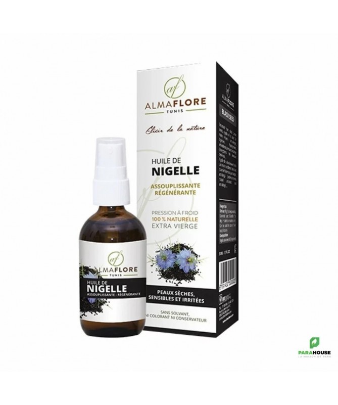 ALMAFLORE Huile de Nigelle BIO 50ML Les bienfaits de l'huile de nigelle pour la peau: ALMAFLORE Huile de Nigelle Elle est idéale pour les peaux abimées, irritées et matures. Elle est nourrissante, elle redonne élasticité et douceur à la peau. Elle se caractérise par ses actions: anti-infectieuse, antiseptiques, anti-inflammatoires et antimycosiques. Cicatrisante. Elle convient pour le traitement des rougeurs, acnés et irritations cutanées. ALMAFLORE Huile de Nigelle est trés efficace contre les démangeaisons. Propriétés et bienfaits de l'huile de nigelle pour les soins capillaires: Renforce la fibre capillaire et ralentit la chute de cheveux. ALMAFLORE Huile de Nigelle traite les démangeaisons du cuir chevelu.