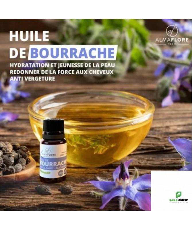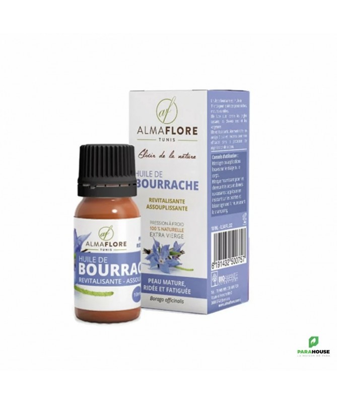 ALMAFLORE Huile de Bourrache 1 0ML C'est une huile anti-âge. Réparatrice et régénératrice pour les cellules de la peau puisque ALMAFLORE Huile de Bourrache est riche en Oméga 6. C'est une huile raffermissante. Hydratante et nourrissante, elle est extrêmement adoucissante. Elle apaise et hydrate les peaux même sensibles. ALMAFLORE Huile de Bourrache protége de desséchement et prévient des vergetures. Les bienfaits de l'huile de bourrache pour les cheveux: elle ralentit la chute , fortifie les cheveux et leur redonne brillance , force et éclat surtout pour les cheveux ternes et fatigués. Les bienfaits de l'huile de bourrache pour les ongles:fotifie les ongles abimés, fragiles et cassants. Sa particularité réside dans sa teneur remarquable en acide gamma-linolénique (AGL ou GLA), un acide gras essentiel de la famille des oméga-6, rare et au puissant pouvoir régénérant et anti-inflammatoire pour la peau.