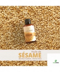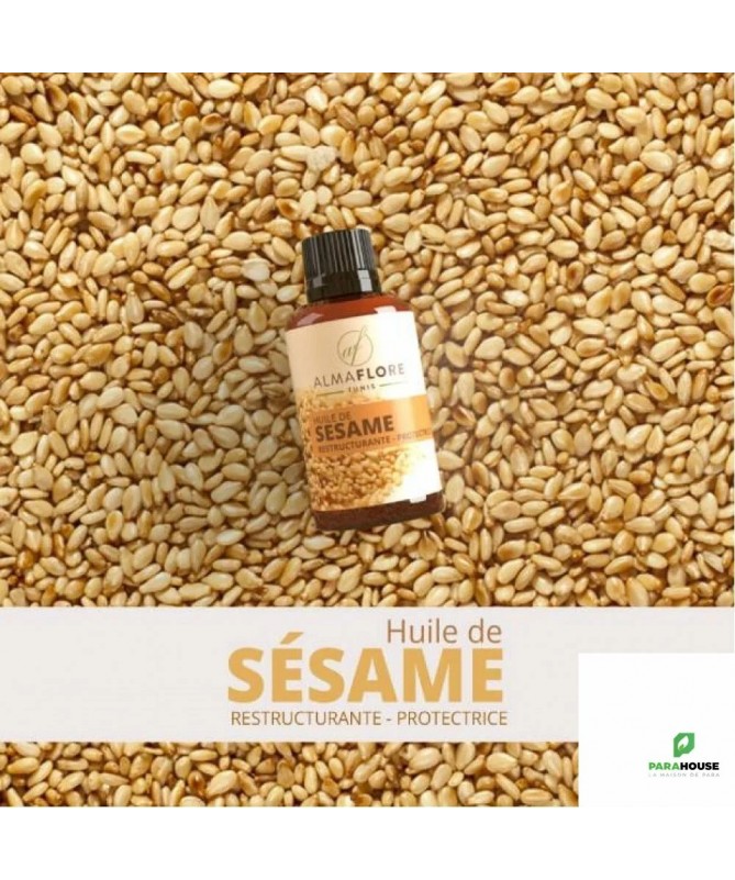 ALMAFLORE HUILE DE SESAME 10ML L'huile de sésame de Almaflore possède plusieurs p ropriétés : 1- Propriétés cosmétiques intéressant l’aromathérapeute (voie locale) ALMAFLORE HUILE DE SÉSAME protège la peau des agressions extérieures Action antioxydante (vit E) très pénétrante, elle régénère, assouplit la peau, la protège des UV Agit sur les desquamations Tonifie cheveux et ongles Idéale pour les massages longs de type ayurvédiques 2- Propriétés et indications thérapeutiques (consommation alimentaire ou voie orale) Régulatrice de l’appétit Protectrice cardio-vasculaire, anti-athéromateuse (évite les dépôts graisseux) Hypocholestérolémiant (↓ cholestérol, HDL, LDL) (expérimentation animale) Anti-infectieuse Antioxydante Améliore la fonction hépatique ALMAFLORE HUILE DE SÉSAME protectrice du système nerveux central De texture moyennement fluide, légèrement dorée et à l'arôme doux et caractéristique, cette huile possède une affinité remarquable avec la peau. Elle pénètre sans laisser de film gras excessif, tout en délivrant ses actifs nourrissants. Appliquée en masque pour les cheveux, elle gaine, nourrit les longueurs, donne de la brillance et aide à protéger les cheveux des agressions thermiques et environnementales.