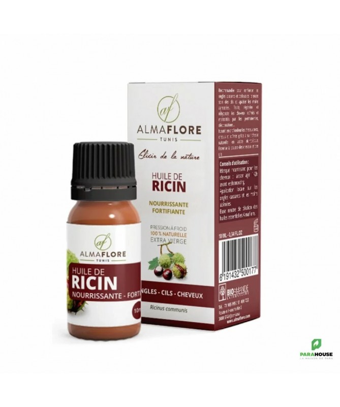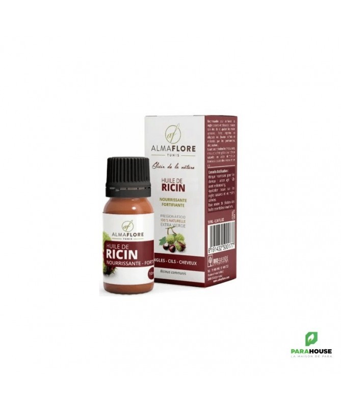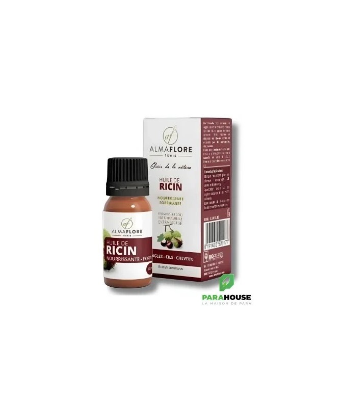 ALMAFLORE Huile de RICIN BIO 10ML . Reconnue pour sa texture dense et onctueuse, elle est particulièrement prisée pour ses propriétés réparatrices et fortifiantes hors du commun. Sa richesse en acide ricinoléique (un acide gras rare) lui confère l'essentiel de ses bienfaits. Ce soin pur et naturel agit en profondeur pour nourrir, réparer et stimuler. Que ce soit pour densifier votre chevelure, fortifier vos ongles cassants, apaiser votre peau ou nourrir vos cils, cette huile bio est un incontournable d'une routine beauté naturelle et efficace en Tunisie Propriétés et bienfaits de l'huile de ricin pour les cheveux et les ongles: Tonifie la fibre capillaire et favorise la repousse des cheveux. Renforce les cils et les sourcils (plus de densité) Hydrate et protège la fibre capillaire (effet soyeux). Favorise la microcirculation du cuir chevelu. Stimule la pousse et ralentit la chute. Idéale pour les soins des cheveux fourchus. Action antipelliculaire. Conseils d'utilisation : Masque Capillaire : Appliquer sur les longueurs et pointes, laisser poser 1 à 2 heures sous une serviette chaude avant le shampoing. Soin Cils/Sourcils : Appliquer une infime quantité au pinceau chaque soir sur une peau parfaitement démaquillée. Soin Localisé Peau : Mélanger 1 goutte d'huile de ricin avec 10 gouttes d'une huile légère (comme le jojoba) avant application.
