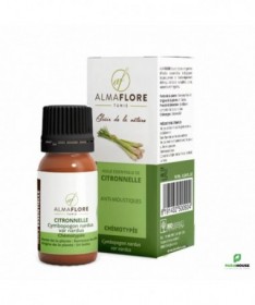 ALMAFLORE HUILE ESSENTIELLE DE CITRONNELLE 10ML Comme tous les cymbopogons, la citronnelle de java est une herbe originaire d’indonésie qui présente de longues feuilles étroites, des tiges et des inflorescences également linéaires. Molécules aromatiques : géraniol, citronnellol, citronnellal Partie distillée : partie aérienne Propriétés principales de ALMAFLORE HUILE ESSENTIELLE DE CITRONNELLE : Anti-inflammatoire percutanée Antibactérienne moyenne Fongicide Déodorante et antiseptique Répulsive de moustiques Indications traditionnelles : Arthrites, tendinites, rhumatismes+++ Présence de moustiques (préventif) et piqure de moustique (curatif)+++ Transpiration excessive Conseils d'utilisation: Almaflore huile essentielle de citronelle est déconseillée dans les premiers mois de la grossesse Il est recommandé d'utliser l'huile essentielle de citronelle par voie externe : 3 gouttes H.E.C.T. + 3 gouttes H.V. noisette en massage aux endroits douloureux et le long de la colonne vertébrale. Pour éloigner les moustiques, en diffusion atmosphérique ou sur les membres exposés, après 16h et à 3 reprises.