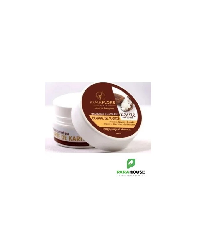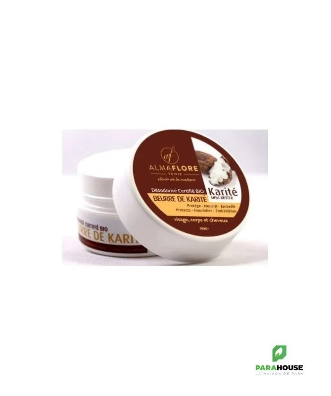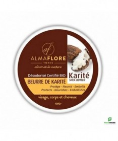 ALMAFLORE Beurre de Karité Désodorisé CERTIFE BIO 100GR ALMAFLORE Beurre de Karité qui est extrément riche en vitamines est un indispensable qui protége la peau des méfaits du soleil, l'adoucit et regénére les peaux abimées.Il nourrit également les cheveux et leur redonne brillance et beauté.Désodorisé par un passage de vapeur d'eau. Le beurre de karité almaflore est très facilement et durablement absorbé par la peau. Très efficace comme baume pour les cheveux puisqu'elle rendra vos cheveux souples et brillants. Les hommes aussi pourront l'utiliser comme après-rasage afin de calmer le feu du rasoir, adoucir et nourrir la peau. Grâce aux acides gras qu'il contient, le beurre de karité favorise la cicatrisation, prévient les rides, hydrate et protège votre peau contre les agressions du froid ou de la chaleur.