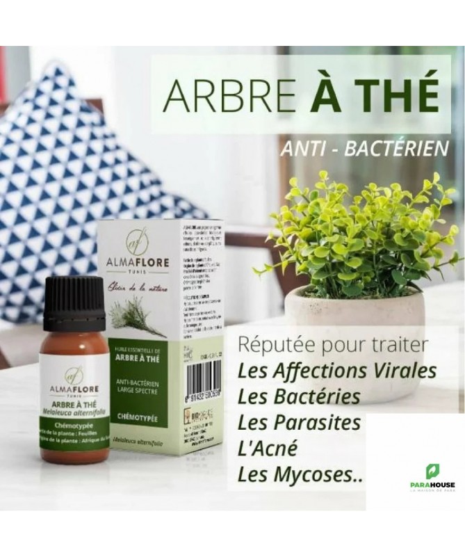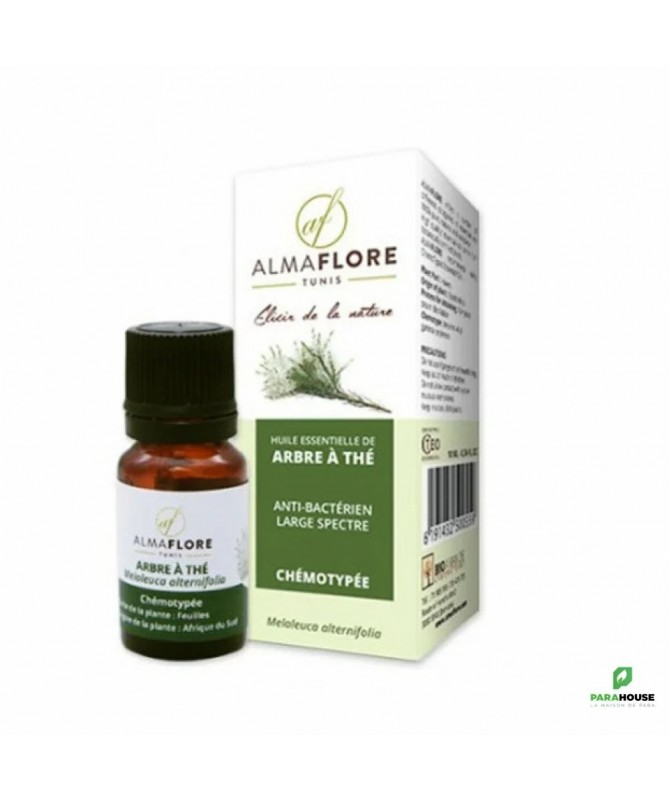 ALMAFLORE Huile Essentielle de Tea tree ( arbre à thé ) BIO 10ML ALMAFLORE Huile Essentielle de Tea tree est un anti-infectieux et un antifongique. Elle stimule le système immunitaire. Elle s'attaque aux champignons responsable des célèbres mycoses. C'est aussi un antiseptique puissant, qui tonifie le cuir chevelu. ALMAFLORE Huile Essentielle de Tea tree servira également de conservateur naturel pour vos préparations cosmétiques grâce à ses propriétés bactéricides. Action antibactérienne puissante et large spectre, elle est idéale pour désinfecter les petites plaies et purifier la peau. Effet antifongique très efficace : Notamment recommandée contre Candida albicans, elle est une alliée pour lutter contre les mycoses cutanées ou unguéales. Soutien immunitaire et antiviral : Utilisée en diffusion ou en application locale (diluée), elle aide l’organisme à se défendre lors des périodes de fragilité. Apaisante et radioprotectrice : Elle peut aider à limiter et apaiser les sensations de brûlures ou d’échauffement cutané, notamment liées à certains traitements médicaux. Purifiante et assainissante pour la peau : Elle régule l'excès de sébum, assainit les peaux à tendance acnéique et contribue à retrouver un éclat sain. Tonique pour le cuir chevelu : Purifie le cuir chevelu gras ou sujet aux pellicules, laissant une chevelure saine et revitalisée. Agent de conservation naturel : Ajoutée à vos émulsions cosmétiques maison (crèmes, lotions aqueuses), elle prolonge naturellement leur durée de vie. Précautions d’emploi importantes : Ne pas utiliser pure sur la peau (sauf sur un petit bouton localisé, ponctuellement). Toujours la diluer dans une huile végétale (ex : Jojoba, Noye d'abricot). Déconseillée pendant les 3 premiers mois de grossesse, l’allaitement , et aux enfants de moins de 3 ans . Tenir hors de portée des enfants. Éviter le contact avec les yeux et les muqueuses. Effectuer un test cutané dans le pli du coude 24h avant toute utilisation pour vérifier l’absence de réaction allergique.