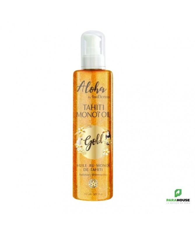 Description :Inoderma Aloha est une huile au Monoi de Tahiti d’origine Polynésienne, obtenue grâce à la macération de fleurs de Tiaré dans l’huile de noix de coco. Dotée d’un parfum doux et envoûtant, Aloha est appréciée pour ses vertus hydratantes, adoucissantes et assouplissantes.Aloha facilite le bronzage en empêchant la peau de se dessécher. Aloha illumine la peau et sublime le bronzage.Aloha Monoi OIL Pailletée GOLD Spray s’utilise également en après-soleil.Conseils D’utilisation :Il est recommandé d'Appliquer Aloha inoderma sur le corps et les cheveux.Masser délicatement pour faire pénétrer le soin. Ne pas rincer.Agiter le flacon avant utilisation.A base d’huile de coco, l’huile au monoï se solidifie dès que la température descend au-dessous de 20°C. Cela n’affecte pas ses propriétés, il suffit de la réchauffer avant de l’utiliser.Composition :Extrait de fleur de Tiaré : Hydratante. Traite et prévient les cheveux fragilisés et desséchés, permet de réaliser un parfait bronzage, et de traiter les coups de soleil.Noix de coco: Nourrissante et réparatrice.