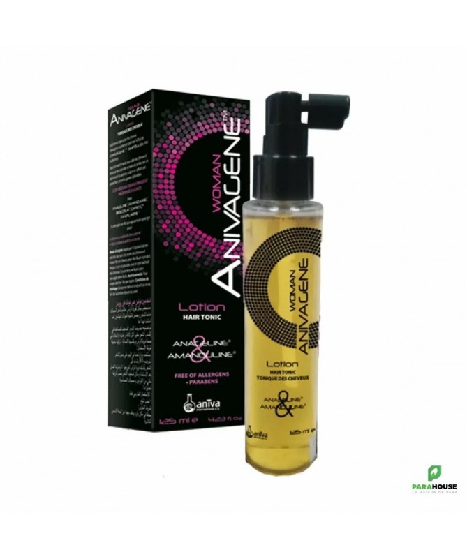 ANIVAGENE Lotion Tonique Capillaire Femme 125ML ANIVAGENE Lotion Tonique Capillaire Femme pour réduire la chute des cheveux et renforcer les cheveux fragiles chez les femmes. ANIVAGENE Lotion Tonique permet de : Réduire la chute des cheveux Revitaliser et gaine les cheveux Conserver le volume normal des cheveux Améliorer la microcirculation du cuir chevelu Assurer une protection contre les agents pathogènes et la flore indésirable Maintenir l'efficacité des Ampoules ANIVAGENE Fortifiantes & Énergisantes pour les Cheveux Composition : BIOANAGELINE : Un cocktail nutritif et revitalisant d'origine naturelle pour le bulbe et les cheveux, composé d'un extrait végétal bio riche en peptides, oligo-éléments et vitamines. BIOAMANDULINE: Oligopeptides naturels issus de l'amande douce bio. BioEcolia : Oligosaccharide α-glucane obtenu par synthèse enzymatique à partir de sucres naturels (saccharose et maltose). Capixyl TM : Le complexe breveté composé d'un peptide biomimétique de quatre acides aminés et d'un extrait de trèfle rouge riche en biochanine A. Kapilarine : Le complexe végétal composé d'extraits de quatre plantes différentes : Kigelia Africana, Gingko Biloba, Salvia Sclarea, Zeylanicum Cannelle, agissent en synergie et aident à rééquilibrer l'état du cuir chevelu et à limiter la chute des cheveux Romarin, Thym & Sauge Sans parabènes Sans allergènes Testé au nickel Facile à utiliser Testé dermatologiquement Formule extra délicate Idéal pour tous les types de cheveux Conseils d'utilisation : Appliquer 5 à 8 pulvérisations une fois par jour sur la racine des cheveux et masser le cuir chevelu pour répartir le produit. Ne pas rincer et procéder au coiffage habituel des cheveux. Il a une texture légère pour une application facile.