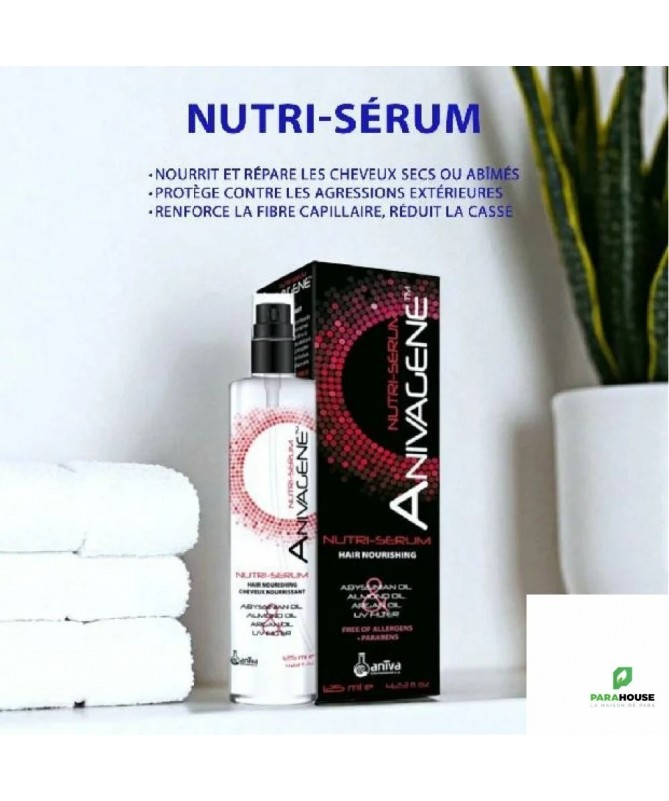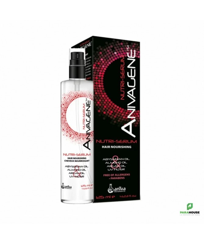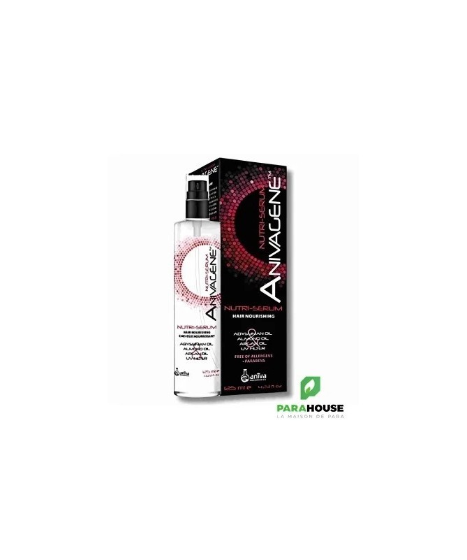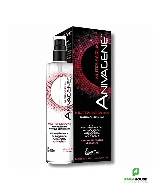 ANIVAGENE Nutri Serum Cheveux Nourrissant 125ML ANIVAGENE Nutri Serum Cheveux Nourrissant est un soin capilaire nourrissant pour protéger les cheveux abîmés. ANIVAGENE Nutri Serum permet de : Nourrir et réparer les cheveux Protèger les cheveux contre les rayons UV, le soleil, le vent, le sable, le sel, les colorants, le chlore Maintenir les cheveux forts en évitant les cassures et les pointes fourchues Donner aux cheveux un aspect brillant et sain Améliorer la maniabilité des cheveux Composition : Aqua, Stearyl Alcohol, Behentrimonium Chloride, Cetyl Esters, Phenoxyethanol, Polyquaternium-37, Polysorbate 20, Propylene Glycol, Crambe Abyssinica Seed Oil, Prunus Amygdalus Dulcis Oil, Argania Spinosa Kernel Oil, Caprylyl Glycol, Propylene Glycol Dicaprylate/Dicaprate, Parfum (fragrance), Amodimethicone, Panthenol, Benzophenone-4, Niacinamide, Trideceth-6, C11-15-Isoalcanes, Trideceth-3, Trideceth-15, Cetrimonium Chloride, Alcohol, Acetic Acid. ANIVAGENE Nutri Serum est : Sans parabènes Sans allergènes Testé au nickel Testé dermatologiquement Formule extra délicate Texture légère Absorption facile Conseils d'utilisation : Vaporiser sur les cheveux secs ou humides. Appliquer principalement sur les pointes des cheveux à une distance de 10-15 cm. Ne pas rincer. Formule extra-douce. Texture légère. Absorption facile
