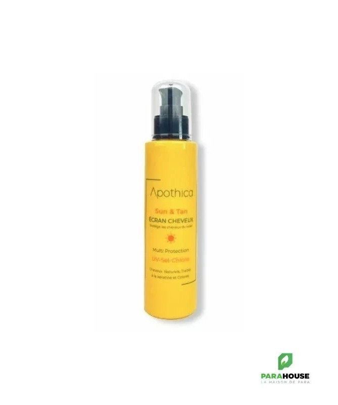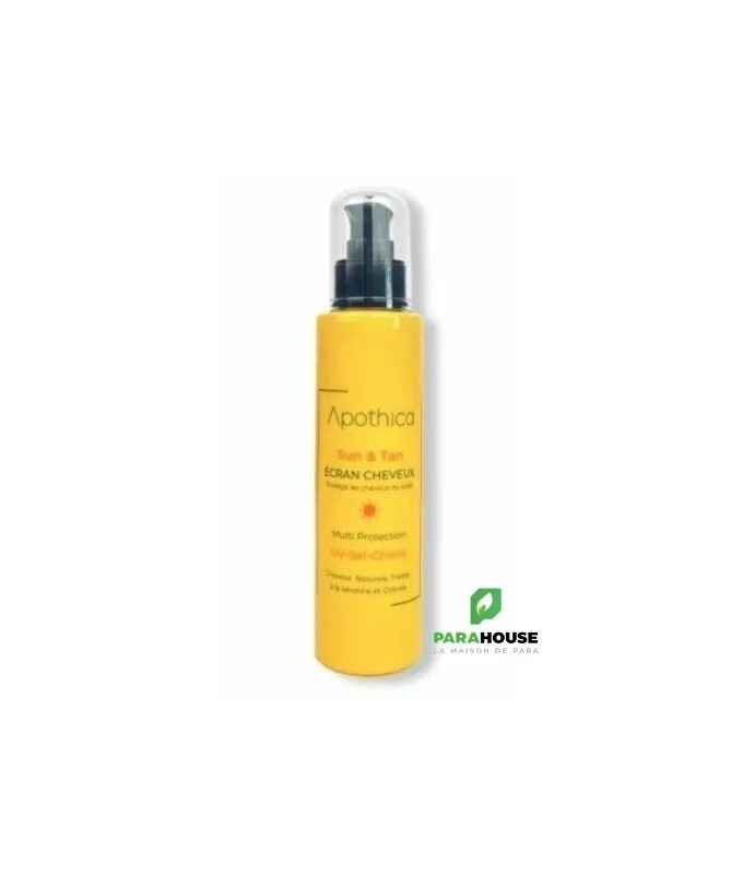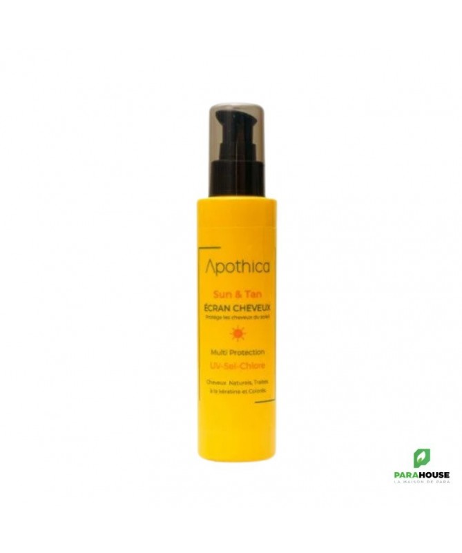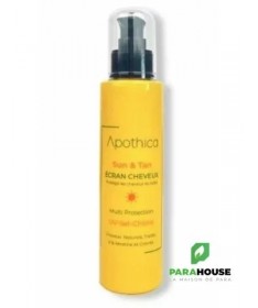 Ce fluide solaire d’été conçu par les laboratoires Apothica est un soin protecteur qui préserve les cheveux des méfaits d’une exposition prolongée au soleil.Ce fluide d’été solaire protecteur de Apothica a été spécifiquement élaboré pour apporter de la douceur à vos cheveux sans les alourdir. Il s’utilise sans rinçage et dispense un effet non-gras très naturel. Son format nomade vous permet de l’emmener partout avec vous pour une utilisation immédiate.Sublimez et réparez votre chevelure avec le Shampooing APOTHICA Kera Liss Lissant 250mlL’écran cheveux by Apothica Sun est un protecteur pour les cheveux, il protège des UV, sel etchlore grâce à la présence des filtres solaires et des analogues de silicones végétales qui gainent et protègent les cheveux.Conseils d'utilisation :Appliquez sur cheveux secs ou mouillés, avant de vous exposer aux rayons UV, au sel ou au chlore, afin de protéger et gainer vos cheveux.