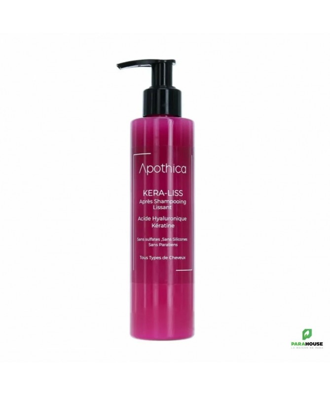 APOTHICA KERA LISS APRES SHAMPOOING LISSANT 200ML APOTHICA KERA LISS SHAMPOOING LISSANT est un soin capillaire sans sulfate, sans paraben et sans silicones. Pour une chevelure saine et protégée grâce aux analogues de silicones d’origine végétale utilisés dans toute la gamme capillaire Apothica. APOTHICA KERA LISS APRES SHAMPOOING est ont formulé avec de l’acide hyaluronique et de la kératine pour un effet irréprochable tout en restant dans le clean et le green. conseils d'utilisation : Étalez en douceur : utilisez vos doigts comme un peigne, mèche par mèche. Évitez le cuir chevelu Insistez sur les pointes et zones rebelles (frisottis).