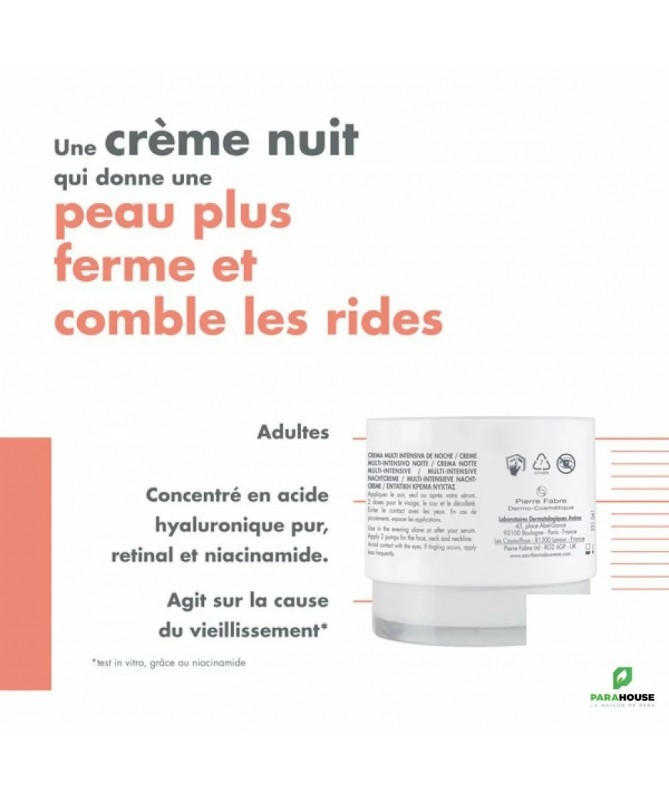 AVENE HYALURON ACTIV B3 Creme Multi Intensive Nuit 40ML AVENE HYALURON ACTIV B3 Creme Multi Intensive Nuit est une crème nuit intégrale réparatrice, contient du rétinal, acide hyaluronique pur et niacinamide pour agir sur la cause du vieillissement. La peau est plus ferme, les rides sont comblées. La formule de AVENE HYALURON ACTIV B3 contient : Niacinamide (2%) aussi appelé vitamine B3, qui stimule les cellules et prolonge leur longévité : la peau se régénère durablement. Extrait d'Haritaki, fruit de la longévité, actif protecteur d'origine naturelle. Rétinal, actif anti-âge dermatologique de référence. Il stimule le renouvellement cellulaire et la synthèse de collagène. Cet actif est responsable de la teinte de la formule. Véritable soin cocooning pour la nuit, sa texture délicatement parfumée apporte du confort à la peau, sans fini gras. Sa teinte légérement orangée est liée à la présence de rétinal. La crème multi-intensive nuit Hyaluron Activ B3 est un soin éco-conçu contenant 97% d'ingrédients d'origine naturelle, sans ingrédients d’origine animale, le tout dans un pot pompe pratique et sécuritaire. Composition : AVENE THERMAL SPRING WATER (AVENE AQUA). CAPRYLIC/CAPRIC TRIGLYCERIDE. GLYCERIN. SQUALANE. BUTYROSPERMUM PARKII (SHEA) BUTTER (BUTYROSPERMUM PARKII BUTTER). CARTHAMUS TINCTORIUS (SAFFLOWER) SEED OIL (CARTHAMUS TINCTORIUS SEED OIL). PENTAERYTHRITYL TETRACAPRYLATE/TETRACAPRATE. CETEARYL ALCOHOL. BEHENYL ALCOHOL. NIACINAMIDE. C20-22 ALKYL PHOSPHATE. C20-22 ALCOHOLS. RETINAL. SODIUM HYALURONATE. TERMINALIA CHEBULA FRUIT EXTRACT. ADENOSINE. ACACIA SENEGAL GUM. CETEARYL GLUCOSIDE. FRAGRANCE (PARFUM). HELIANTHUS ANNUUS (SUNFLOWER) SEED OIL (HELIANTHUS ANNUUS SEED OIL). RED 33 (CI 17200). SODIUM BENZOATE. SODIUM HYDROXIDE. TOCOPHEROL. TOCOPHERYL GLUCOSIDE. WATER (AQUA). XANTHAN GUM Conseil d'utilisation 1 fois par jour Appliquer 2 doses sur le visage, le cou et le décolleté. En cas de picotements, espacer les applications.