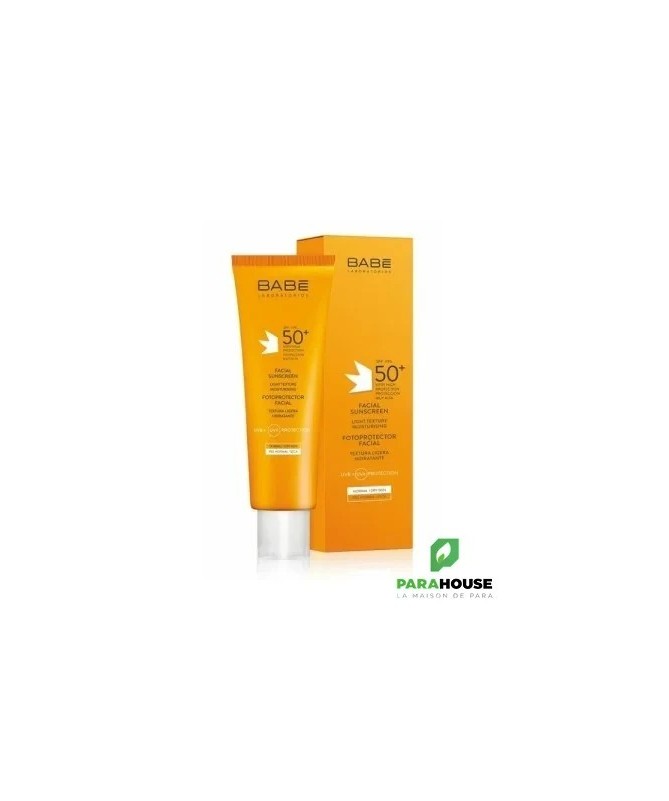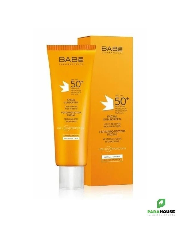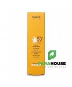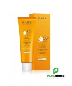 BABE ECRAN SOLAIRE FACIAL SPF50+ est une très hautre protection solaire à texture légère, indiquée pour les peax normales et sèches. Il contribue à la prévention et à la protection du visage contre le photo-vieillissement, les coups de soleil et l’apparition d’imperfections. Sa formule est enrichie en actifs apaisants comme l’aloès et la camomille et en antioxydants qui protègent votre peau tout en aidant à réduire les dommages solaires. Cet écran solaire résistant à l’eau se carctérise par une absorption rapide avec une finition uniforme qui empêche le photovieillissement et les taches.