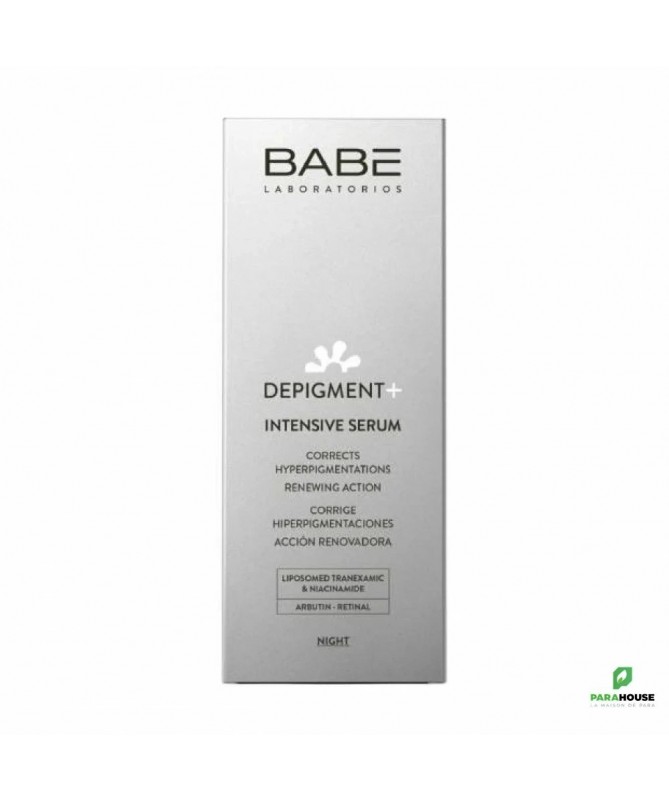 BABE DEPIGMENT+ INTENSIVE SERUM 30ML BABE DEPIGMENT+ INTENSIVE SERUM est un sérum à haute concentration qui corrige l'hyperpigmentation et régénère la peau. Il agit en profondeur pour corriger l'hyperpigmentation et régénérer la peau grâce à une combinaison d'actifs tels que l'acide tranexamique liposomal, la niacinamide, l'arbutine et le rétinal. Ce sérum offre une action dépigmentante et régénérante, idéale pour les peaux sensibles. Il s'applique le soir, en deuxième étape du soin anti-taches de la gamme Depigment+. BABE DEPIGMENT+ INTENSIVE SERUM Corrige l'hyperpigmentation. Action régénératrice intensive : Améliore le teint des taches brunes. Action ciblée/globale. Action dépigmentante et régénératrice intensive. Agit en profondeur. Prévient l'apparition des taches brunes (protection contre la lumière bleue et la pollution). Composition : AQUA, PROPANEDIOL, COCO-CAPRYLATE/CAPRATE, DIMÉTHICONE, POLYGLYCERYL-6 POLYRICINOLEATE, GLYCÉRINE, ARBUTINE, ACIDE TRANEXAMIQUE, NIACINAMIDE, MALTODEXTRINE, FERMENT DE LACTOBACILLUS, CARNOSINE, HYALURONATE DE SODIUM, RÉTINAL, HYDROXYPINACOLONE RETINOATE, TOCOPHÉROL, PALMITATE D'ASCORBYLE, CAMPHRE, ADIPATE DE DIISOPROPYLE, HYDROXYACÉTOPHÉNONE, 1,2-HEXANEDIOL, ACRYLATES/C10-30 ALKYL ACRYLATE CROSSPOLYMER, CAPRYLYL GLYCOL, GOMME XANTHANE, MANNITOL, PHOSPHATIDYLCHOLINE, PARFUM, MÉTABISULFITE DE SODIUM, PROPYLÈNE GLYCOL, ACIDE PHYTIQUE, HYDROGÉNÉ CITRATE DE GLYCÉRIDES VÉGÉTAUX, GALLATE DE PROPYLE, ALCOOL CÉTYLIQUE, DÉCYL GLUCOSIDE, TÉTRAMÉTHYL ACÉTYLOCTAHYDRONAPHTHALÈNES, CHLORURE DE SODIUM, ACÉTATE DE DIMÉTHYL PHÉNÉTHYLE, HYDROXYDE DE SODIUM, SORBATE DE POTASSIUM, BENZOATE DE SODIUM [PI05077] Conseils d'utilisation : Utilisez-le quotidiennement le soir avant votre crème hydratante habituelle. Appliquez une petite quantité de produit sur votre main et massez-la sur une peau propre et sèche jusqu'à absorption complète. Vous pouvez compléter votre routine dépigmentante avec la Lotion Éclat et le Fluide Contrôle. Remarque : La couleur du produit peut évoluer au fil du temps, ce qui est normal et n'altère ni son innocuité ni son efficacité. Convient à tous les types de peau. Particulièrement indiqué pour prévenir et éliminer la pigmentation, éclaircir le teint et atténuer les imperfections.
