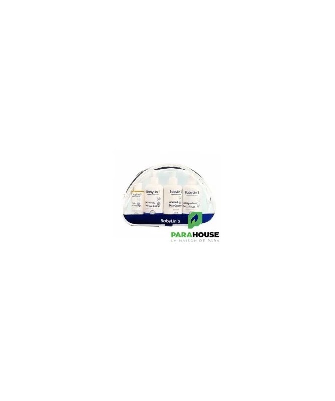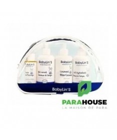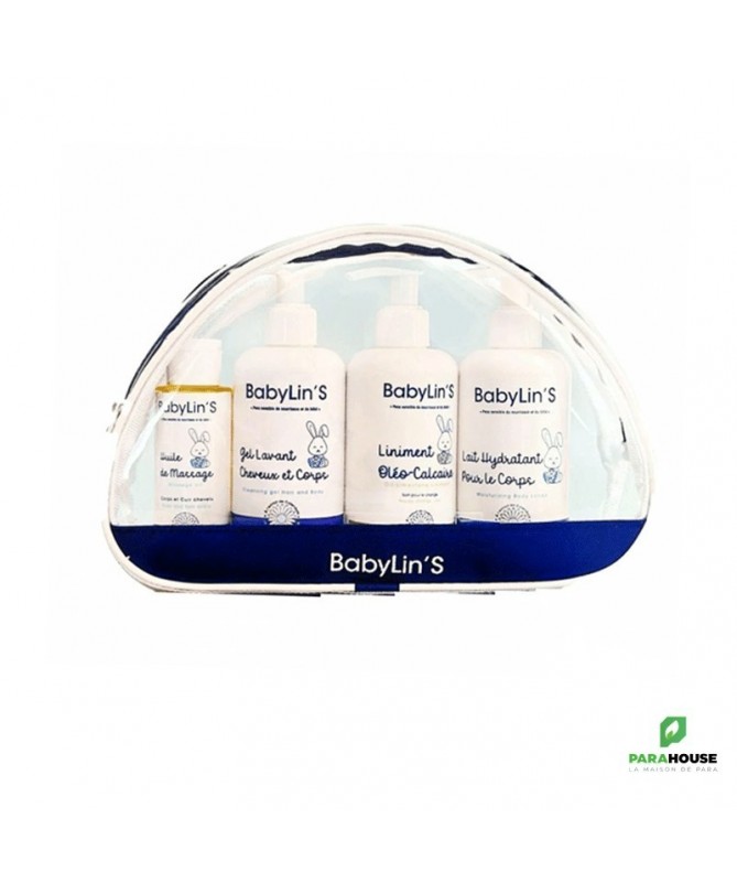 Babylin’s trousse happy moments est composée de :Gel nettoyant 250mlLait hydratant 250mlLiniment 250mlHuile de massage 100mlTrousse transparent offert.