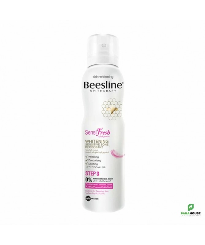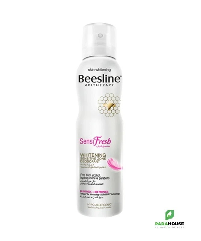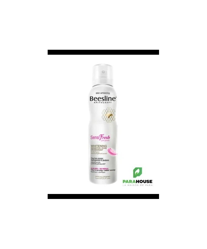 BEESLINE SENSIFRESH Deodorant Eclaircissant Intime Spray - 150ML BEESLINE SENSIFRESH Deodorant Eclaircissant Intime est un déodorant hygiénique doux pour la peau pour les zones intimes pour contrôler les bactéries responsables des odeurs, unifier le teint, absorber l'humidité et apaiser la peau sensible. BEESLINE SENSIFRESH Deodorant Eclaircissant Intime : Action anti-transpirante et parfum frais Teint éclatant et unifié Composition : Butane. Isobutane. Propane. Cyclomethicone. C12-15 Alkyl Lactate. Aqua. Potassium Alum (Alum Rock). Tocopheryl Acetate (Vitamin E). Aloe Barbadensis (Aloe Vera) Extract. Magnesium Ascorbyl Phosphate (Vitamin C). Caprylic/Capric Triglyceride & Diacetyl-Boldine (Lumiskin). Propanediol & Rhamnose & Glucose & Glucuronic Acid (Teflose). Lactic Acid. Sodium Lactate. Octyldodecanol. Niacin (Vitamin B3). Parfum. Cera Propolis (Propolis). SANS luminium chloride, colourants, ethyl alcohol, hydroquinone, kojic acid, parabens, petrochemicals, phthalates and ingredients of animal origin (except bee by-products). Conseils d'utilisation : Utiliser BEESLINE SENSIFRESH 2x par jour. Tenez la canette à 15 cm de la peau et du spray. Ne pas appliquer sur une peau abîmée ou irritée. En cas de blocage du diffuseur, retirez la buse et rincez à l'eau chaude.