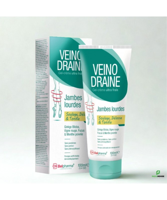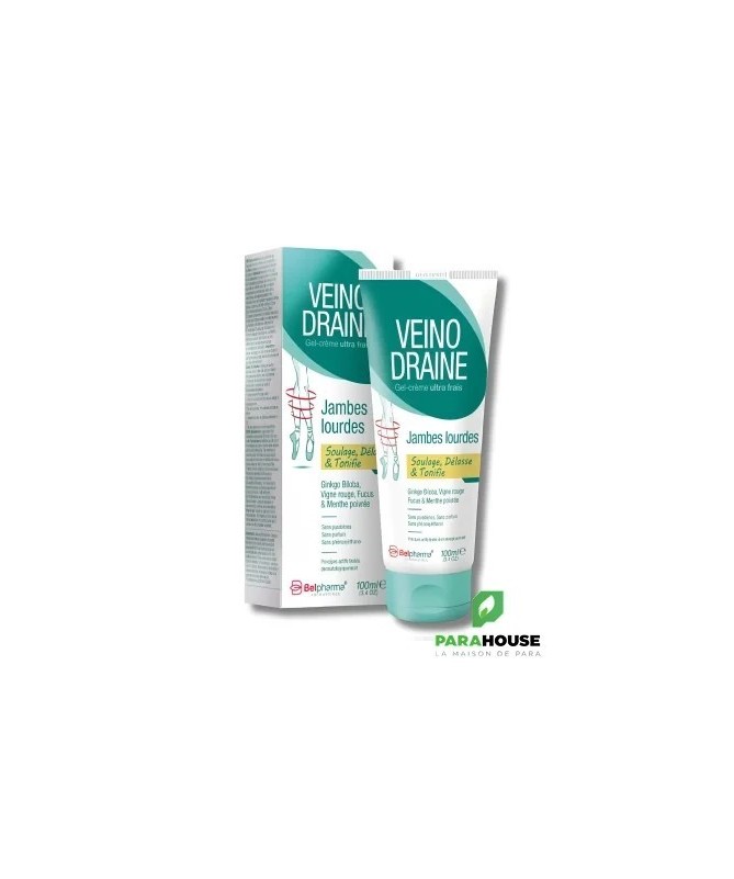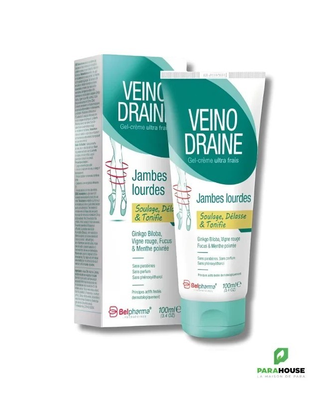 Veinodraine Gel-Crème Jambes Lourdes 100 mlVeinodraine est un gel-crème qui favorise le retour veineux en tonifiant la paroi des veines. Sa texture pénètre rapidement pour un effet immédiat et vous permet de vous habiller dès l’application. Il soulage efficacement les sensations de jambes lourdes et les problèmes de varices, tout en apportant une sensation de fraîcheur et de légèreté.Ingrédients et bienfaitsExtrait de ginkgo biloba :favorise la bonne circulation sanguine.Extrait de vigne rouge (Vitis Vinifera) :vertus veino-toniques prouvées.Extrait de fucus (Fucus vesiculosus) :effet anti-inflammatoire et potentialise l’action de la vigne rouge.Huile essentielle de romarin (Rosmarinus Officinalis) :action veino-tonique.Huile essentielle d’eucalyptus (Eucalyptus Globulus) :effet astringent.Huile essentielle de menthe poivrée (Mentha Piperita) :effet rafraîchissant immédiat et tonifiant.Huile essentielle de citron (Citrus Limonum) :dynamisante et stimulante.Formulé sans parabènes, sans phénoxyéthanol et sans parfum.Conseils d’utilisationAppliquer sur les jambes 2 à 3 fois par jour.Masser vigoureusement de bas en haut avec des mouvements circulaires jusqu’à pénétration complète.Usage externe uniquement. Ne pas avaler.Éviter le contact avec les yeux, le visage et les muqueuses.Ne pas appliquer sur une peau abîmée ou irritée.Conserver à température inférieure à 25° et hors de portée des enfants.