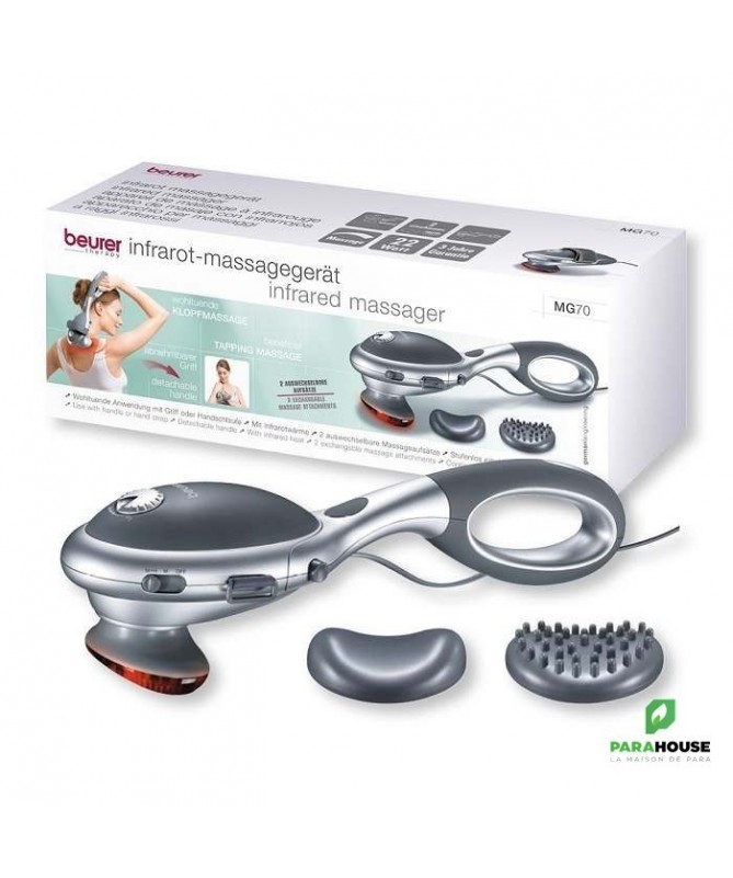 Description :Puissant massage par tapotement pour une agréable détente.Poignée facilement retirable.Massage avec une poignée : pour les parties inaccessibles du dos et des jambes.Massage uniquement avec la tête de massage : pour une application directe et plus puissante.Lanière avec fermeture en Velcro : s'adapte à toutes les tailles.Chaleur infrarouge pouvant être activée séparément.Intensité de massage réglable en continu.2 accessoires de massage amovibles.Poignée ergonomique anti-dérapante pour une manipulation simple et sûre.Température superficielle en cas d'utilisation infrarouge : env. 45 °C (avec température ambiante de 22 °C).22 watts.Conseils d'utilisation :Intensité du massage: Réglage en continu.Chaleur infrarouge: Activable.Accessoires :2 embouts de massage interchangeables.embout doux, embout à picots.