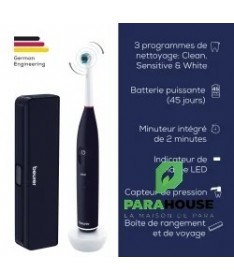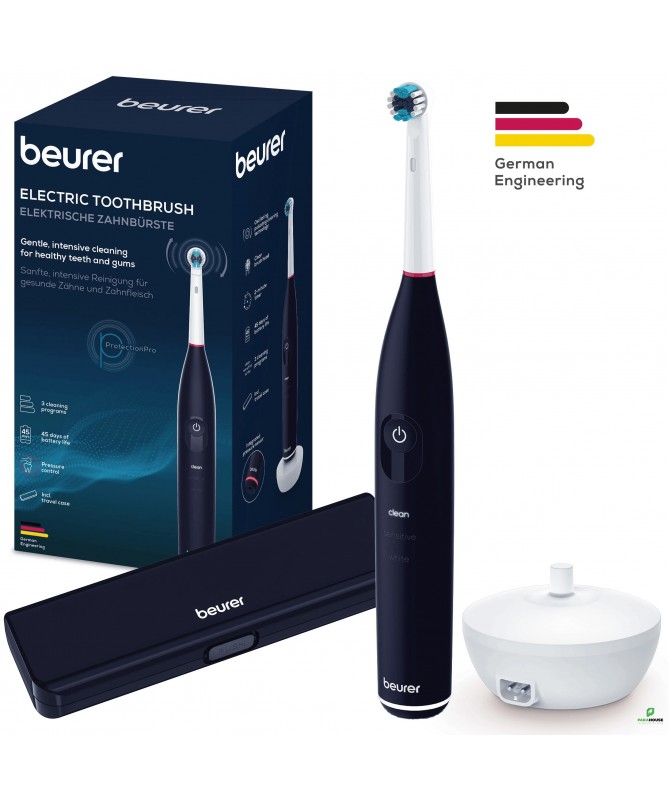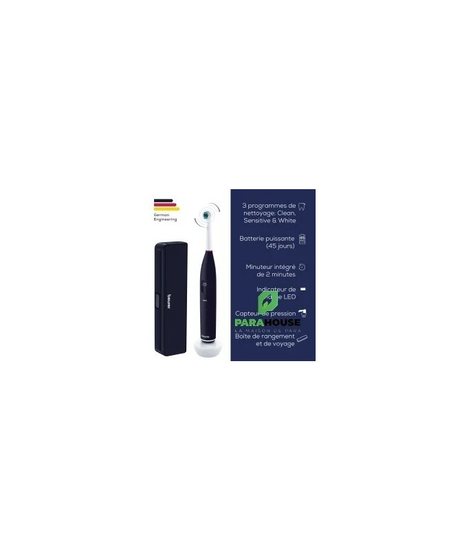 BEURER TB 50 Brosse a Dents Electrique BEURER TB 50 Brosse a Dents Electrique répond à tous vos besoins. La brosse à dents électrique est dotée d’un capteur de pression intégré pour protéger les dents et les gencives. Elle est également équipée d’une batterie puissante d’une autonomie allant jusqu’à 45 jours. Une boîte de rangement et de voyage pratique est également fournie. 3 programmes de nettoyage individuels Batterie puissante dotée d’une autonomie de 45 jours Capteur de pression intégré pour protéger les dents et les gencives Avec boîte de rangement et de voyage pratique Technologie de brossage oscillante et pulsée pour l’élimination de la plaque 3 programmes de nettoyage individuels Clean, Sensitive, White Minuteur 2 minutes intégré Capteur de pression intégré pour protéger les dents et les gencives Batterie puissante dotée d’une autonomie de 45 jours Écran LED magique Voyant LED de charge Comprend une station de charge inductive, un câble de charge USB avec adaptateur et une tête de brosse à dents Clean