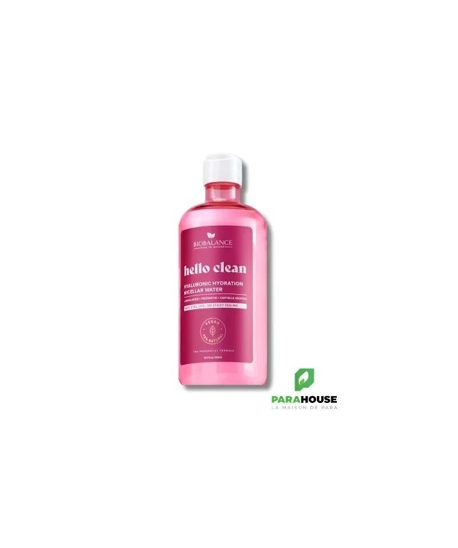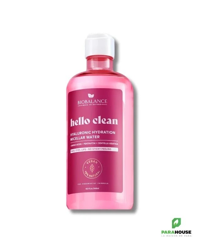 BioBalance Hyaluronic Hydration – Eau micellaire soin visagePropriétés :- Bien plus qu’un simple démaquillant, cette eau micellaire est un véritable soin ultra-doux, adapté même aux peaux sensibles.- Enrichie en acide hyaluronique à triple poids moléculaire (3D), acides aminés, extrait de Centella Asiatica et Pentavitin, elle nettoie efficacement tout en apportant une hydratation intense.- Laisse la peau douce, souple et parfaitement équilibrée.Mode d'utilisation :Appliquer sur le visage, les yeux et les lèvres à l'aide d'un coton, sans frotter. Inutile de rincer.Ingrédients :Aqua, Butylene Glycol, Glycerin, Pentylene Glycol, Propanediol, Polyglyceryl-4 Laurate/Sebacate, Polyglyceryl-6 Caprylate/Caprate, Betaine, Sodium Hyaluronate, Saccharide Isomerate, Inulin, Centella Asiatica Leaf Extract, Sodium PCA, Arginine, Sodium Gluconate, Sodium Lactate, Aspartic Acid, PCA, Glycine, Ala