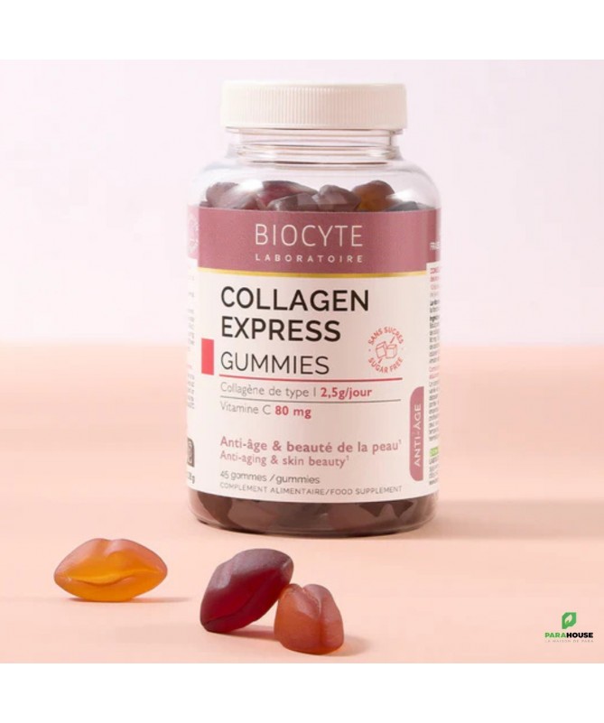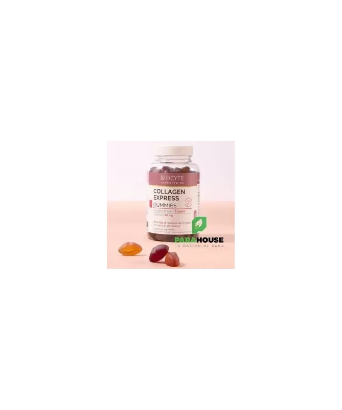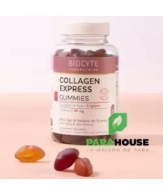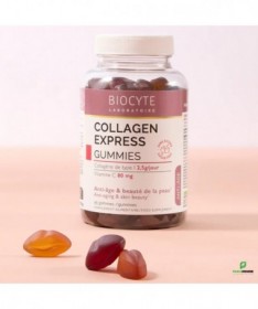 Description :Les Collagen Express Gummies de Biocyte constituent une solution innovante conçue pour redonner jeunesse et éclat à la peau. Formulés à partir de collagène hydrolysé et de vitamine C, ces gummies savoureuses offrent une solution anti-âge efficace et agréable à consommer.Chaque dose journalière de 3 gummies apporte 2,5g de collagène de type I, reconnu pour sa biodisponibilité optimale grâce à son faible poids moléculaire (2000 Da). Ce collagène est associé à 80mg de vitamine C, un actif essentiel qui contribue à la formation normale du collagène et au maintien de la santé cutanée.Les Collagen Express Gummies se distinguent par leur formule sans sucre et leurs goûts ultra gourmands de cassis, pastèque et fraise.Conseils D’utilisation :3 gummies à mâcher par jourPRÉCAUTIONS D'EMPLOI :Un complément alimentaire ne doit pas se substituer à une alimentation variée et équilibrée et à un mode de vie sain. Ne pas dépasser la dose journalière conseillée. Tenir hors de portée des jeunes enfants. Déconseillé aux femmes enceintes ou qui allaitent et aux enfants sans l’avis d’un professionnel de santé. Une consommation excessive peut avoir des effets laxatifs.CONSERVATION :A conserver à une température inférieure à 25°C, dans son emballage hermétiquement fermé, à l’abri de la lumière.Composition :Edulcorants : maltitols, glycosides de stéviol issus de Stevia ; Eau ; Hydrolysat de collagène ; Gélatine ; Ascorbate de sodium (dont vitamine C) ; Acidifiant : acide citrique ; Arômes ; Concentré colorant de carotte et cassis ; Huile de tournesol ; Colorant : anthocyanes ; Concentré colorant de spiruline et carthame ; Agent d’enrobage : cire de carnauba ; Amidon de bléANALYSE NUTRITIONNELLEPour 3 gummies :Hydrolysat de collagène 2500 mgAscorbate de sodium : dont vitamine C 80 mg (100% VNR*)VNR : Valeurs Nutritionnelles de Référence