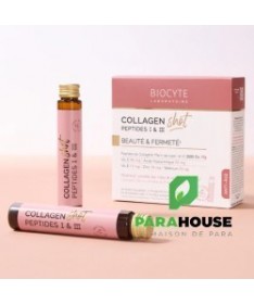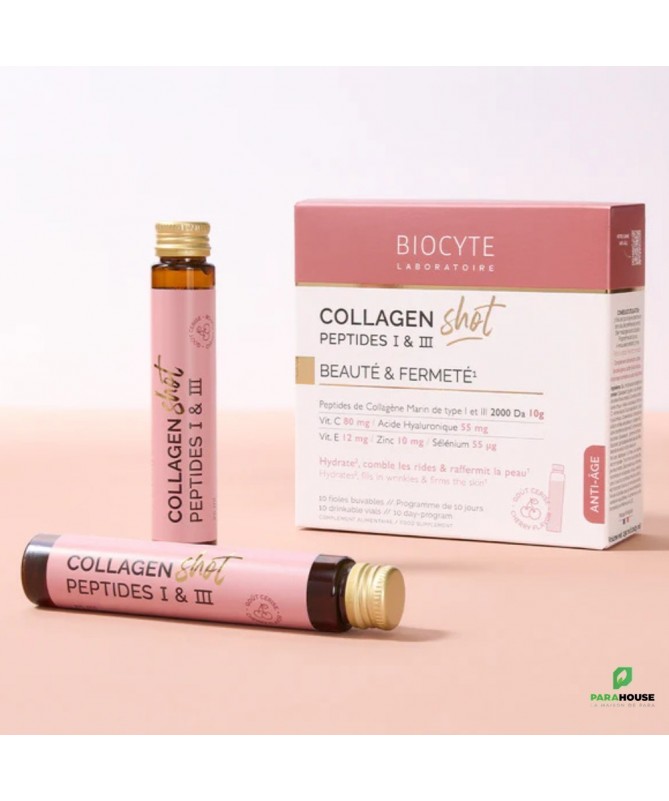 Description :Le Collagen Shot de Biocyte est un complément alimentaire innovant conçu pour sublimer la peau. Formulé à partir de 10 g de collagène marin de types I et III breveté Naticol®, il offre une biodisponibilité optimale grâce à son faible poids moléculaire (2000 Da). Associé à 55 mg d'acide hyaluronique d'origine végétale, ce produit hydrate, redensifie et protège la peau.Enrichi en vitamines C et E, ainsi qu'en zinc et sélénium, le Collagen Shot contribue à la formation normale de collagène et protège les cellules contre le stress oxydatif. Les résultats sont prouvés : +22.8% d'hydratation, +23.7% d'élasticité et -9.4% de rides.*étude menée sur 40 femmes pendant 3 mois, prise de 10g de collagène naticol/jour VS placebo.Cette solution se présente sous forme de fioles pratiques au délicieux goût cerise, à consommer chaque matin. Un programme de 10 jours, renouvelable, pour une peau visiblement plus lisse, ferme et éclatante.Conseils D’utilisation :1 fiole par jour à boire directement sans eau de préférence le matin. Bien mélanger avant utilisation.Programme de 10 jours. À renouveler pendant 3 mois.PRÉCAUTIONS D'EMPLOI :Ne pas dépasser la dose journalière recommandée. Tenir hors de portée des jeunes enfants. Déconseillé aux femmes enceintes et allaitantes, et aux enfants sans l’avis d’un professionnel de santé. Il est important d’avoir un mode de vie sain. Ne se substitue pas à une alimentation variée et équilibrée.CONSERVATION :À conserver à une température inférieure à 25°C.Composition :Eau ; Hydrolysat de collagène de poisson ; Épaississant : glycérol ; Jus concentré de cerise (Prunus cerasus) ; Correcteur d’acidité : acide citrique ; Acide L-ascorbique (Vitamine C) ; Arôme naturel ; Gluconate de zinc ; Acide hyaluronique ; Conservateurs : benzoate de sodium, sorbate de potassium ; Acétate de DL-alpha-tocophéryle (vitamine E) ; Arôme naturel de cerise ; Épaississant : gomme xanthane ; Édulcorant : glycosides de stéviol issus de Stévia ; Sélénite de sodium (dont sélénium).ANALYSE NUTRITIONNELLEPour 1 fiole (25 ml) :Hydrolysat de collagène marin : 10 gAcide Hyaluronique : 55 mgVitamine C : 80 mg (100% VNR*)Vitamine E : 12 mg (100 % VNR*)Zinc : 10 mg (100 % VNR*)Sélénium : 55 μg (100 % VNR*)VNR : Valeurs Nutritionnelles de Référence