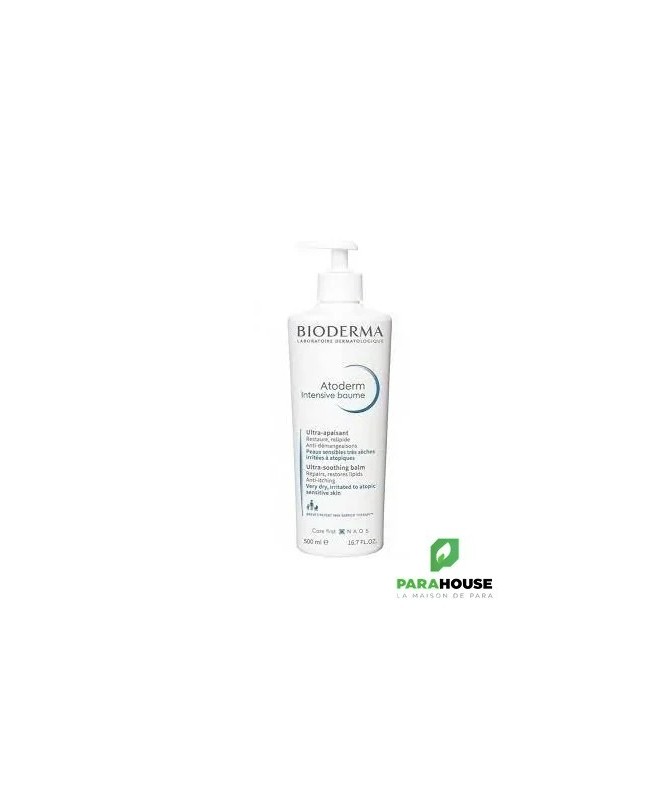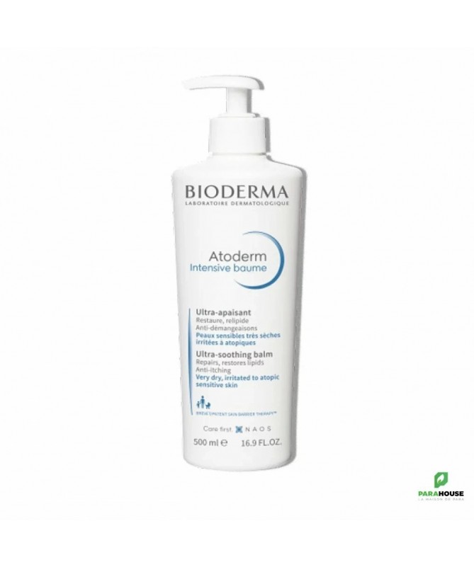 BIODERMA Atoderm Intensive Baume 500ML BIODERMA Atoderm Intensive Baume est un soin intensément anti-démangeaisons et réparateur. Il est ultra-apaisant et ultra-nourrissant et permet de restaurer, relipider et apaiser la peau. BIODERMA Atoderm Intensive Baume augmente la sensation de confort et rend la peau plus resistante et de façon durable. BIODERMA Baume accompagne la prise en charge des peaux sèches sujettes à l'eczéma atopique suivant les nouvelles recommandations européennes en dermatologie Composition : Formule INCI : Aqua/Water/Eau, Glycerin, Paraffinum Liquidum/ Mineral Oil/Huile Minerale, Elianthus Annuus (Sunflower) Seed Oil, Behenyl Alcohol, Sucrose Stearate, Canola/Canola Oil/Huile De Colza, Hydroxyethyl Acrylate/Sodium Acryloyldimethyl Taurate Copolymer, Pentylene Glycol, Beta-Sitosterol, Xylitol, Zinc Gluconate, Acrylates/C10-30 Alkyl Acrylate Crosspolymer, Palmitamide Mea, 1,2-Hexanediol, Caprylyl Glycol, Sodium Citrate, Mannitol, Rhamnose, Sodium Lauroyl Lactylate, Sodium Hydroxide, Polysorbate 60, Sorbitan Isostearate, Tocopherol, Hytosphingosine, Ceramide Np, Ethylhexylglycerin, Ceramide Ap, Cholesterol, Carbomer, Xanthan Gum, Fructooligosaccharides, Caprylic/Capric Triglyceride, Laminaria Ochroleuca Extract, Citric Acid, Ceramide Eop Très bonne tolérance - Ne colle pas - Texture non grasse, riche et confortable - Non parfumé Conseils d'utilisation : Il est recommandé de : Appliquer Atoderm Intensive Baume sur une peau préalablement nettoyée. 3 doses pour un BEBE : 1 dose pour le visage, le cou et la poitrine, 1 dose pour les deux bras et le dos, 1 dose pour les deux jambes. 6 doses pour un ENFANT : 1 dose pour le visage et le cou, 1 dose pour la poitrine, 1 dose pour le dos, 1 dose pour les deux bras, 1 dose pour chaque jambe (x2). 9 doses pour un ADULTE : 1 dose pour le visage et le cou, 1 dose pour la poitrine, 1 dose pour le dos, 1 dose pour chaque bras (x2), 2 doses pour chaque jambe (x2). Masser délicatement jusqu’à pénétration du produit.