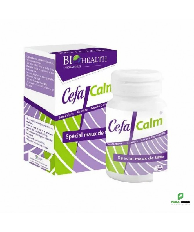 BIOHEALTH CEFACALM 15 Gelules BIOHEALTH CEFACALM est un complément alimentaire : Soulage les maux de tète Soulage les douleurs rhumatismales Réduit la fatigue Contient de la Grande camomille et du Saule blanc Contient du Guarana Contenance 15 gélules Cefacalm se compose de : Saule blanc : antidouleur grâce à sa substance active identique à l’aspirine : La commission Européenneet l’ESCOP reconnaissent l’efficacité de l’écorce de saule pour faire baisser la fièvre et soulager les douleurs rhumatismales ainsi que le mal de tête. Extrait de grande camomille: est traditionnellement utilisé dans la prévention de maux de tête et contribue à la relaxation. Extrait de guarana: La principale substance active de la guarana est la caféine. Ses graines en contiennent de 2,5 % à 7 %, soit de 2 à 3,5 fois plus que les grains de café. Extrait de guarana combattre la fatigue en stimulant le système nerveux central, augmenter la tension artérielle et soulager un mal de tête résultant d’une mauvaise circulation sanguine périphérique en raison de sa teneur en caféine. Composition : INGREDIENTS Pour 2 gélules Pour 4 gélules Extrait de grande camomille 240 mg 480 mg Extrait de SauleBlanc 300 mg 600 mg Salicine 72 mg 144 mg Extrait de guarana 150 mg 300 mg Conseils d'utilisation : ADULTES : 2 à 4 gélules par jour avec un verre d’eau ENFANTS À PARTIR DE 6 ANS : 1 à 2 gélules par jour avec un verre d’eau. Les compléments alimentaires doivent être utilisés dans le cadre d’un mode de vie sain et ne pas être utilisés comme substituts d’un régime alimentaire varié et équilibré. Ne pas dépasser la dose journalière indiquée. Les femmes enceintes et allaitantes doivent demander conseils auprès de leur professionnel de santé avant toute complémentation. Tenir hors de la portée des jeunes enfants. Conserver dans un endroit frais, sec et à l’abri de la lumière.