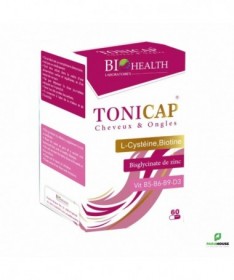 BIOHEALTH TONICAP 60 Gelules BIOHEALTH TONICAP est un complement alimentaire qui permet de : Accélérer la repousse des cheveux. Redonner force et vitalité à la chevelure et aux ongles. Augmenter la résistance aux agression extérieurs. Améliorer visiblement l'état de la chevelure et des ongles Conseils d’utilisation : 2 gélules de tonicap à prendre au cours du petit-déjeuner avec une prise abondante d eau Cure de 3 moins renouvelable Composition : Vitamine B5 ,zinc ,vitamine B6 , vitamine B8 , vitamine B9 , vitamine D3