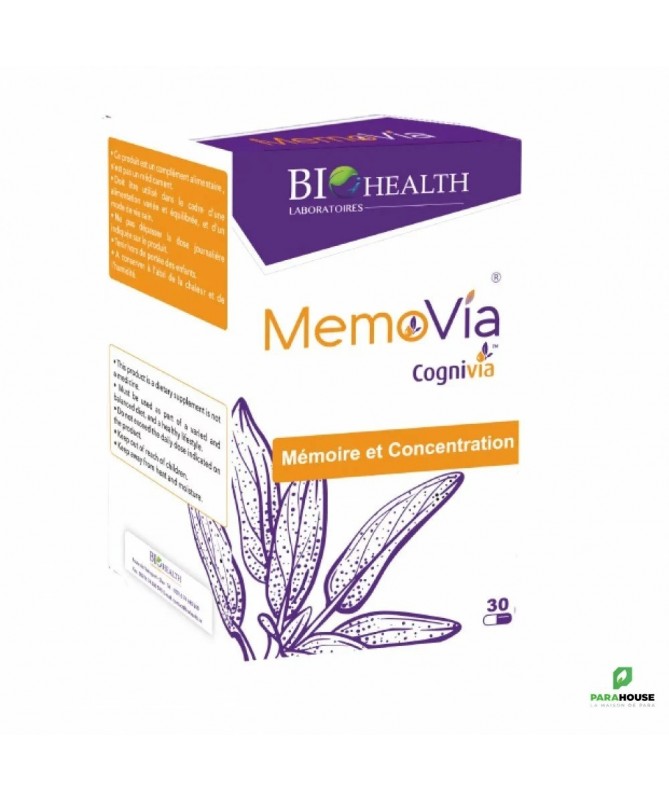 BIOHEALTH MEMOVIA 30 GELULES BIOHEALTH MEMOVIA aide à maintenir : un bien-être mental optimal. la concentration, l'attention et la mémoire. La première association synergique unique de 2 espèces de sauge et a été spécialement développée pour les personnes désireuses de soutenir leur mémoire et leur concentration. Ce sont notamment: les personnes de plus de 50 ans, les étudiants, les managers, les sportifs. Composition : Cognivia ™ (extrait de feuille de sauge de jardin biologique, huile essentielle de sauge espagnole biologique encapsulée par de la gomme d’acacia); enveloppe de la capsule: hydroxypropylméthylcellulose, dioxyde de titane, oxyde de fer jaune; anti-agglomérant: stéarate de magnésium. MEMOVIA ne contient ni gluten, ni lactose, ni sucre. Les capsules sont d’origine végétale.